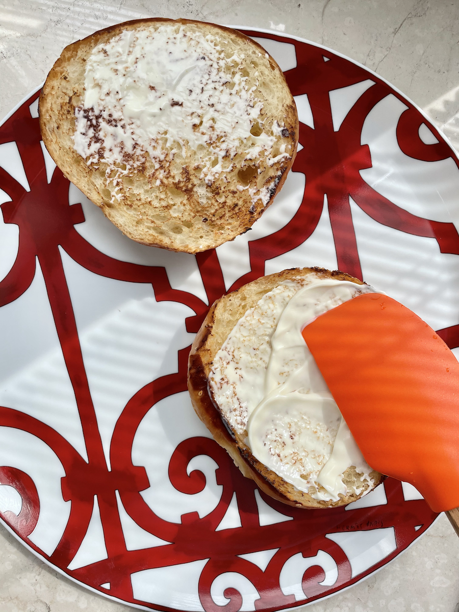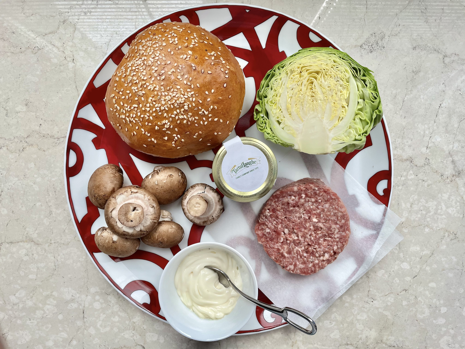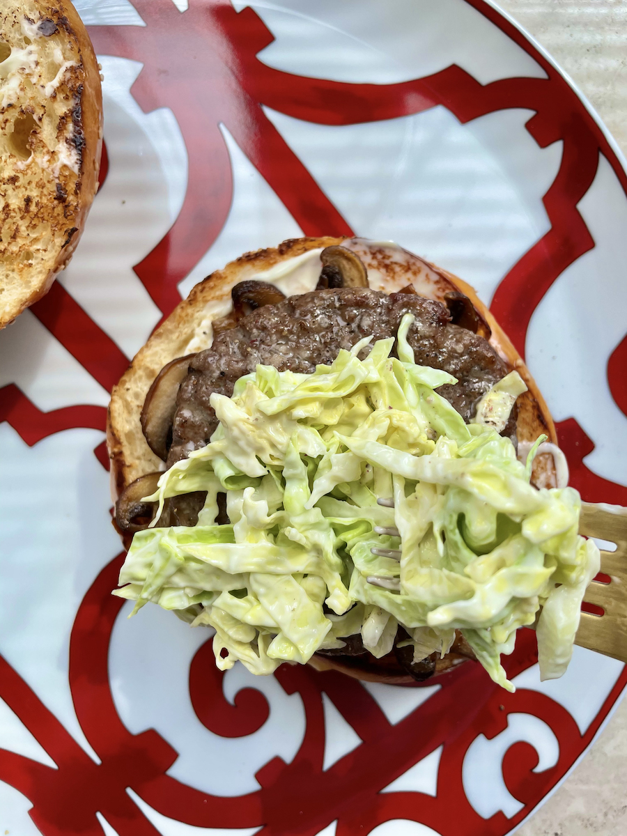 Итак, берем два говяжьих бифштекса, две булки типа «Кайзер» с кунжутом, 6-8 шампиньонов, немного топленого масла, 1 маленький кочан молодой капусты, соль, свежемолотый перец, 4 столовые ложки приличного майонеза и несколько капель трюфельного масла.
