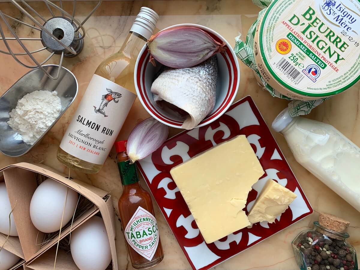 Итак, берем 1 филе дорады, 1 маленькую луковицу-шалот, 200 мл белого сухого вина, свежемолотый перец, соль, 1 желток, 3 белка, 2,5 столовые ложки сливочного масла, 3 столовые ложки муки, 3/4 стакана горячего молока, 3-5 капель табаско, полстакана крупно натертого чеддера.