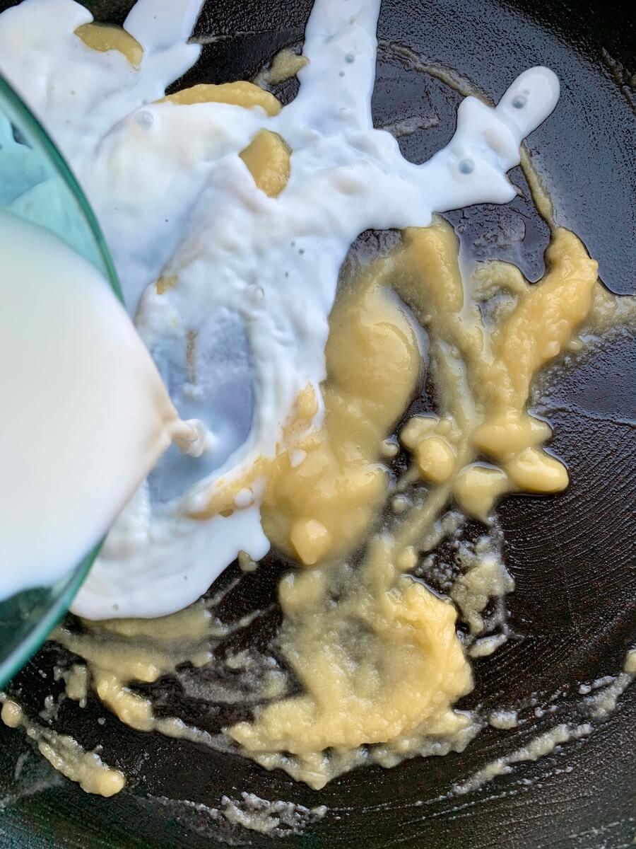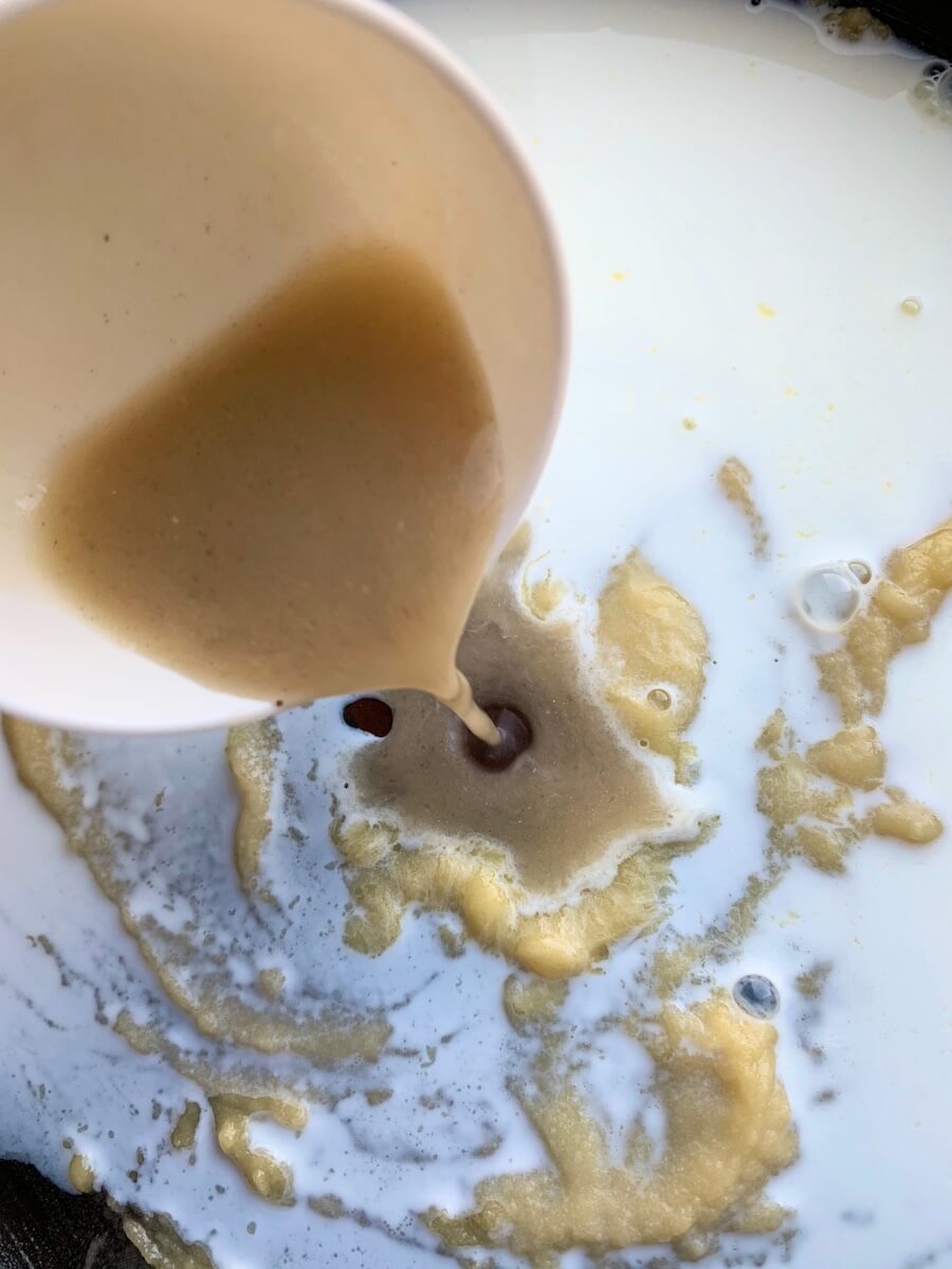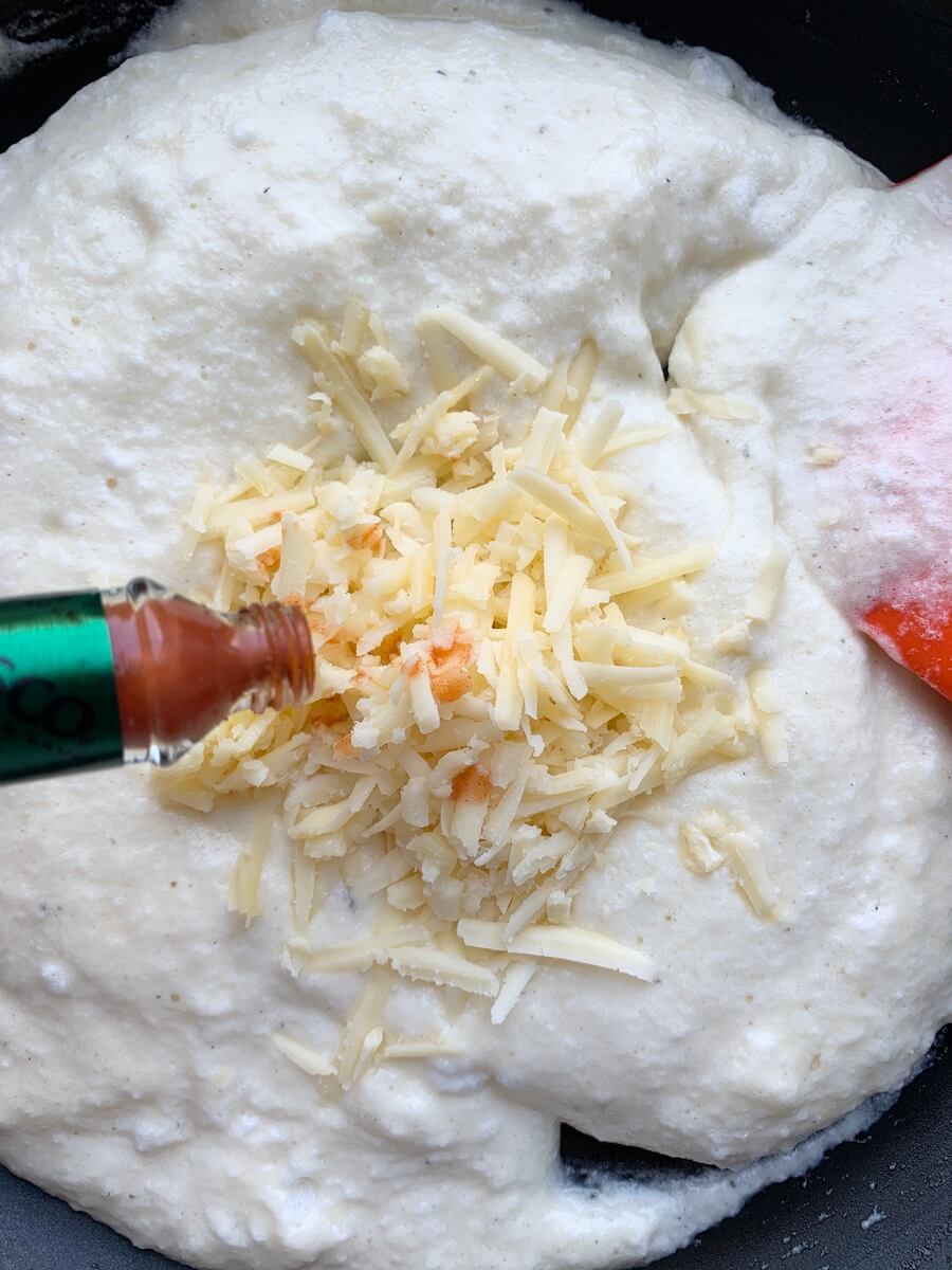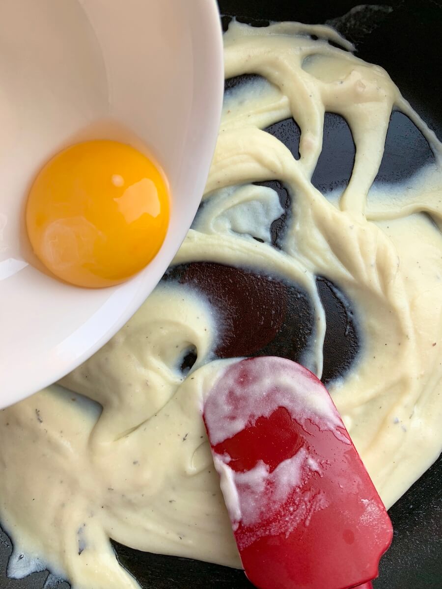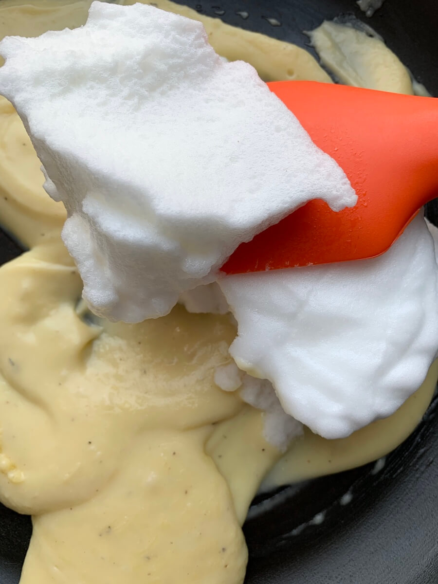 В сковороде разогреть сливочное масло с мукой и прогревать 2 минуты на небольшом огне – до однородного состояния и без изменения цвета. Влить горячее молоко и быстро перемешивать венчиком, довести до кипения. Снять сковороду с огня, ввести 1 желток, перемешать, дать немного остыть. Тем временем взбить в крепкую пену. В сковороду добавить 1/4 белков и перемешать, как крем для тирамису – снизу вверх. Затем добавить оставшиеся белки и 3/4 тертого сыра, перемешать.