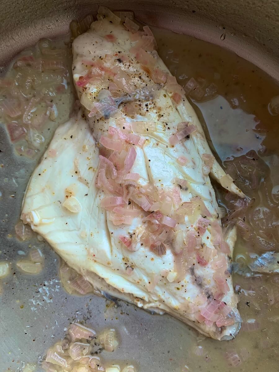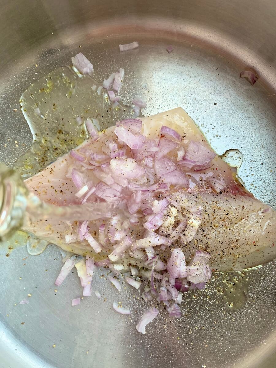 Филе дорады положить в небольшой сотейник, посыпать мелко нарубленным луком-шалот, добавить соль, перец и влить вино. Довести до кипения с открытой крышкой и готовить 6 минут. Затем выложить рыбу на тарелку, оставшуюся жидкость процедить.