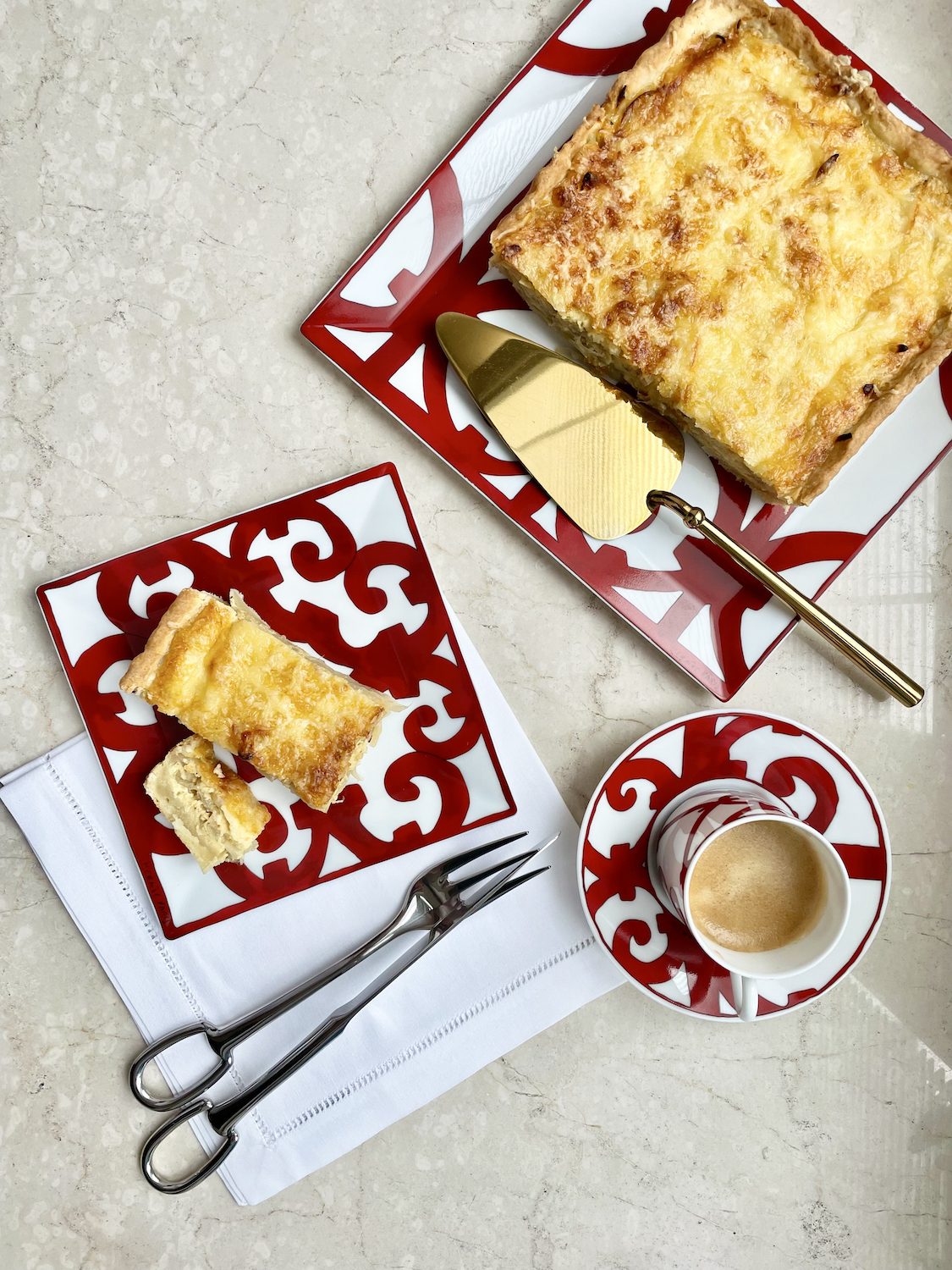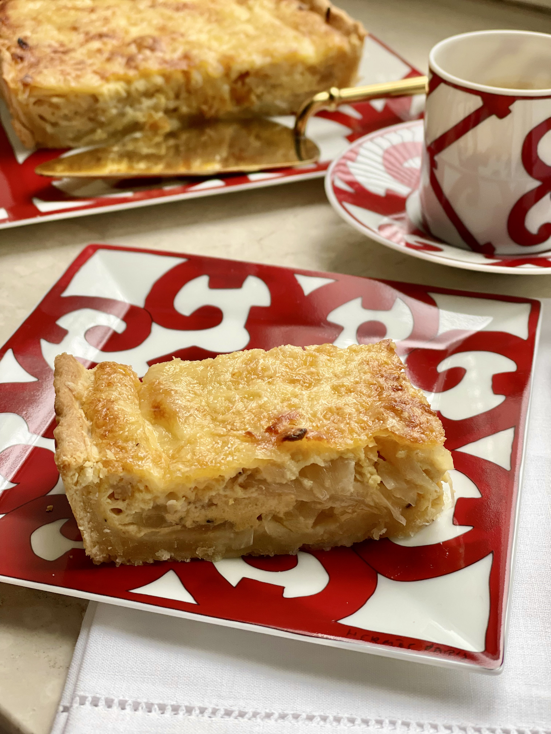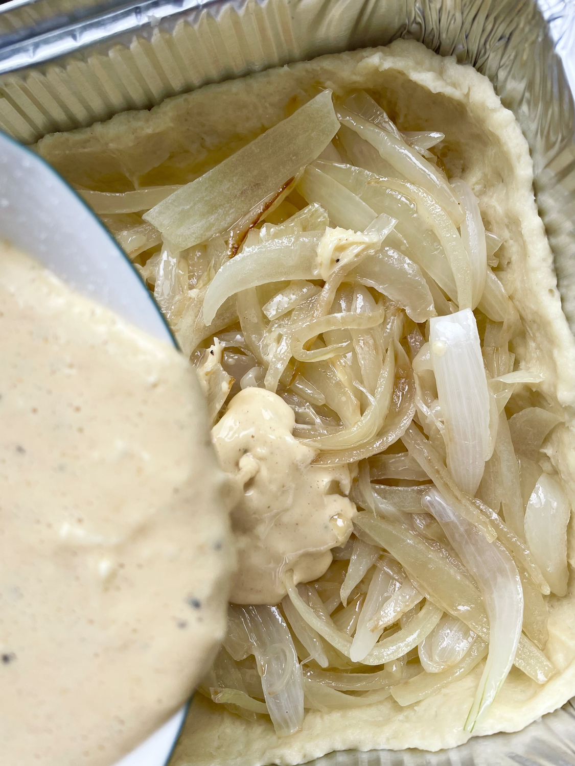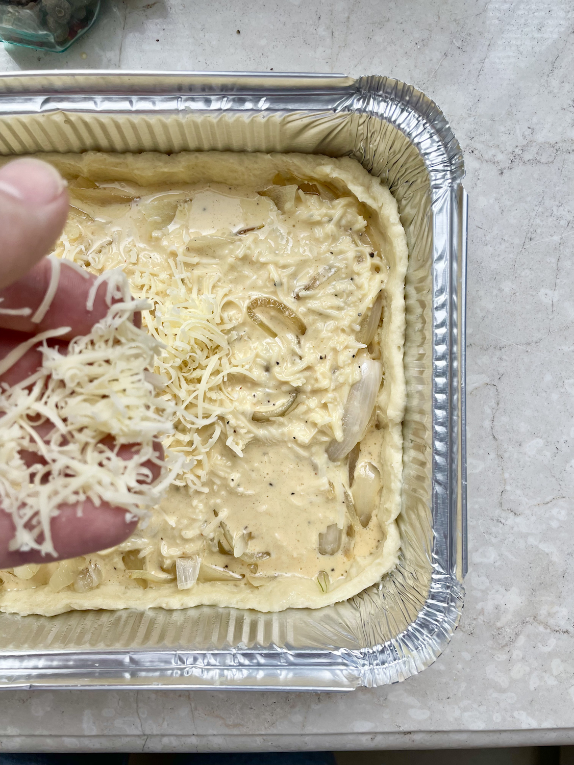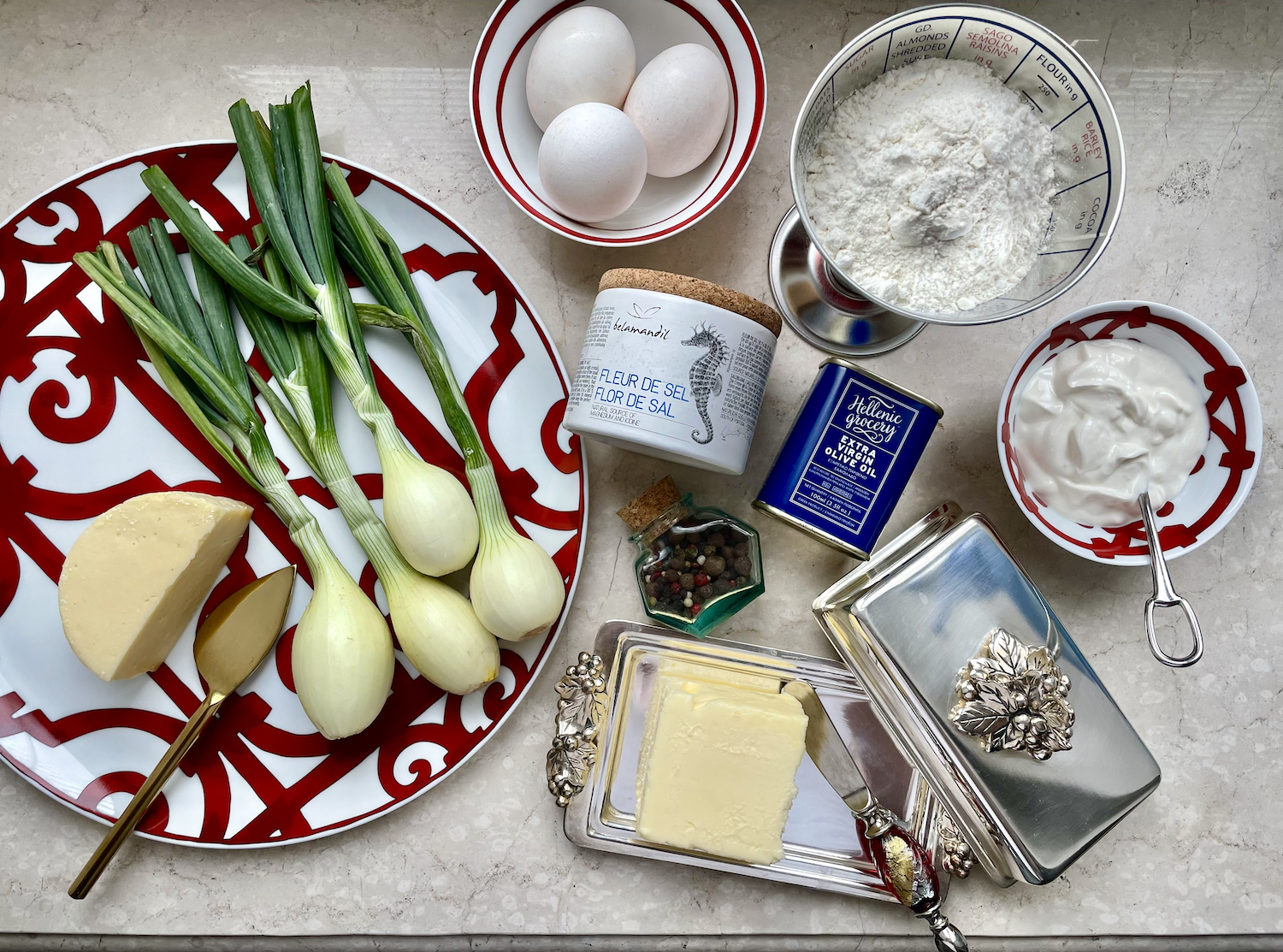 Отже, для тіста беремо: 1 яйце, 50 г розм'якшеного вершкового масла, 1/2 чайної ложки солі, 50 г сметани, 250 г борошна. Для начинки: 8 молодих цибулин, оливкова олія. Для заливки: 100 г сиру середньої твердості, 2 яйця, свіжомелений перець, сіль, 3 столові ложки сметани, 1 столову ложку борошна. За бажанням до цибулі можна додати тунця, оливки, шинку чи гриби.
