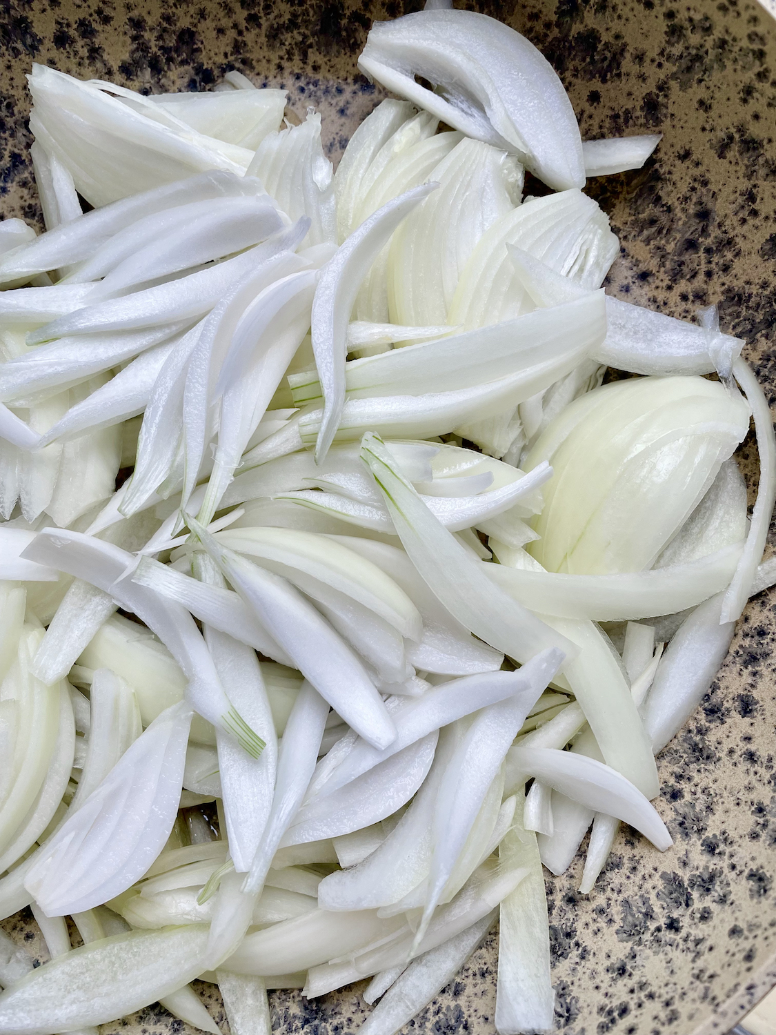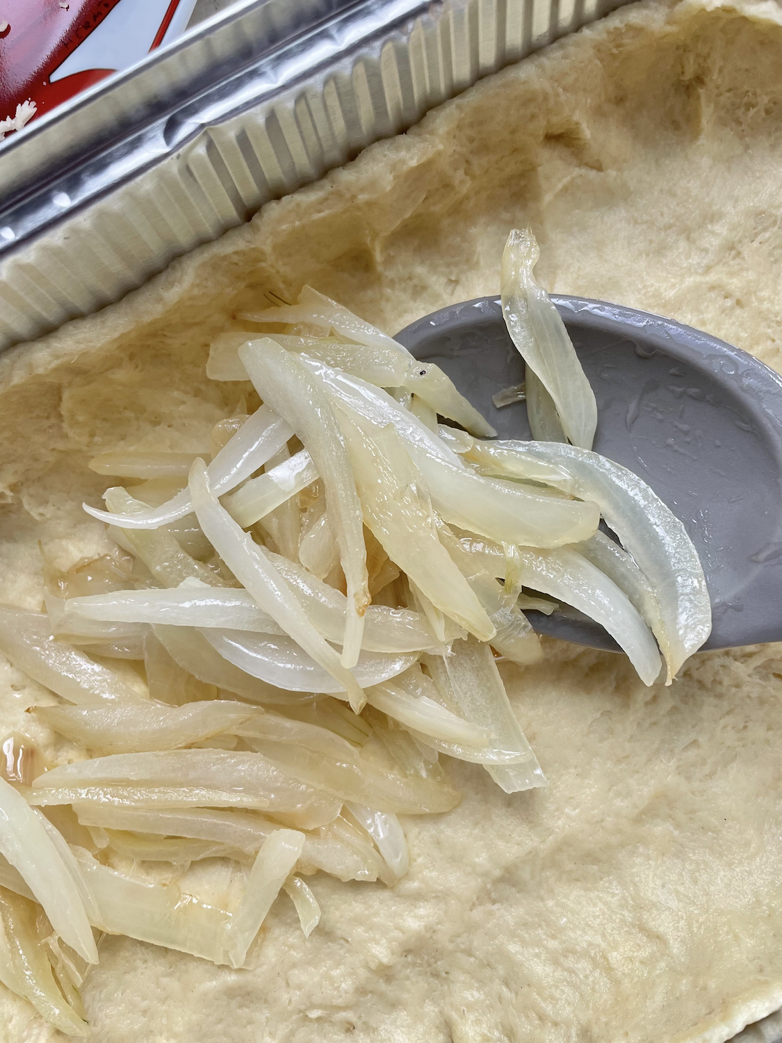 Духовку розігріти до 180 градусів. У сковороді розігріти оливкову олію. Цибулини нарізати вздовж соломкою. Пасерувати на середньому вогні до золотистого кольору, періодично помішуючи. Зняти з вогню, дати охолонути.