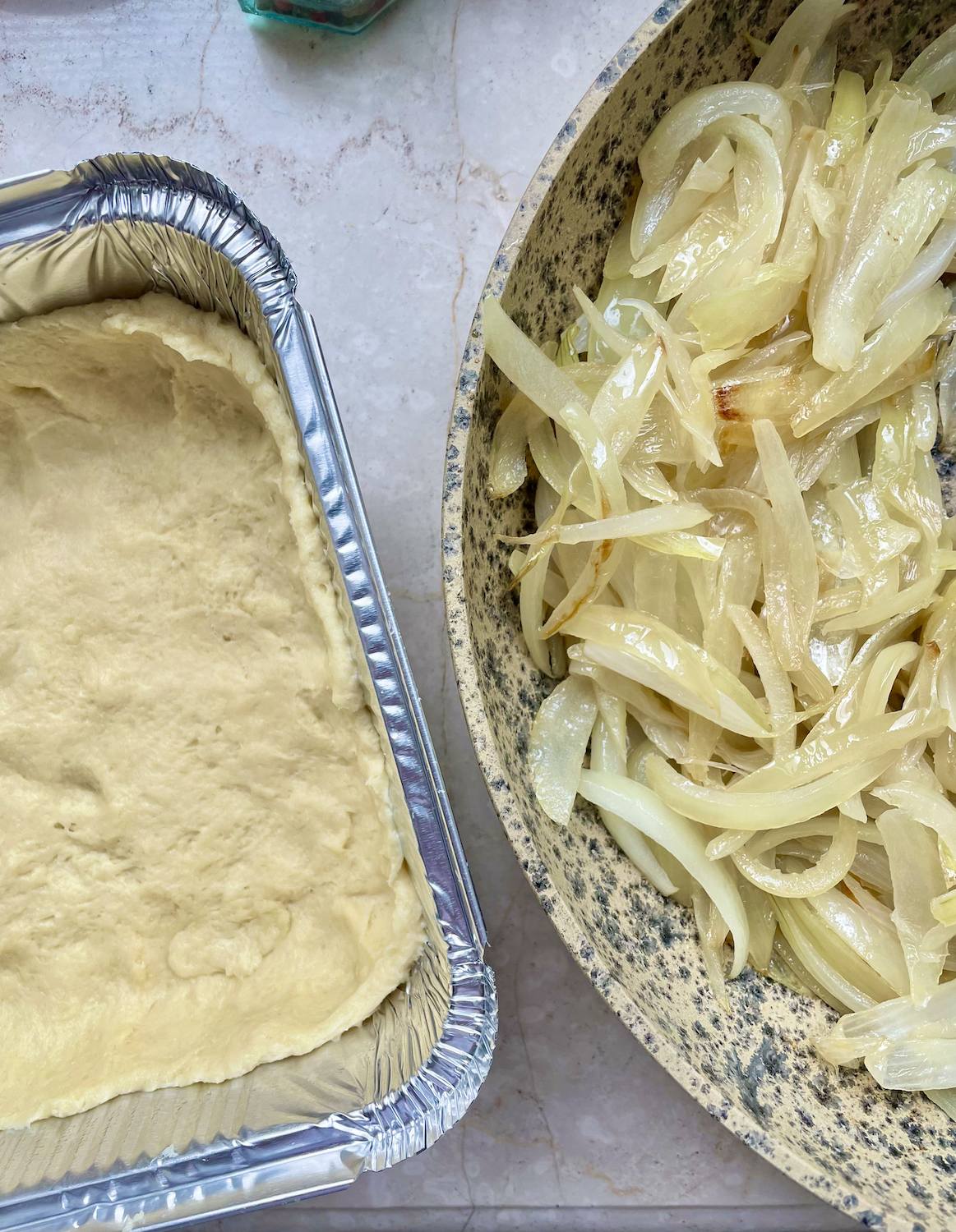 Тим часом приготувати тісто: у чаші комбайна змішати масло та яйце, додати сіль та сметану, знову перемішати, потім всипати борошно, перемішати. Тісто має вийти м'яким та еластичним. Розподілити його формою рівним шаром, створивши бортики висотою 2-3 см. Рівномірно розподілити цибулю.