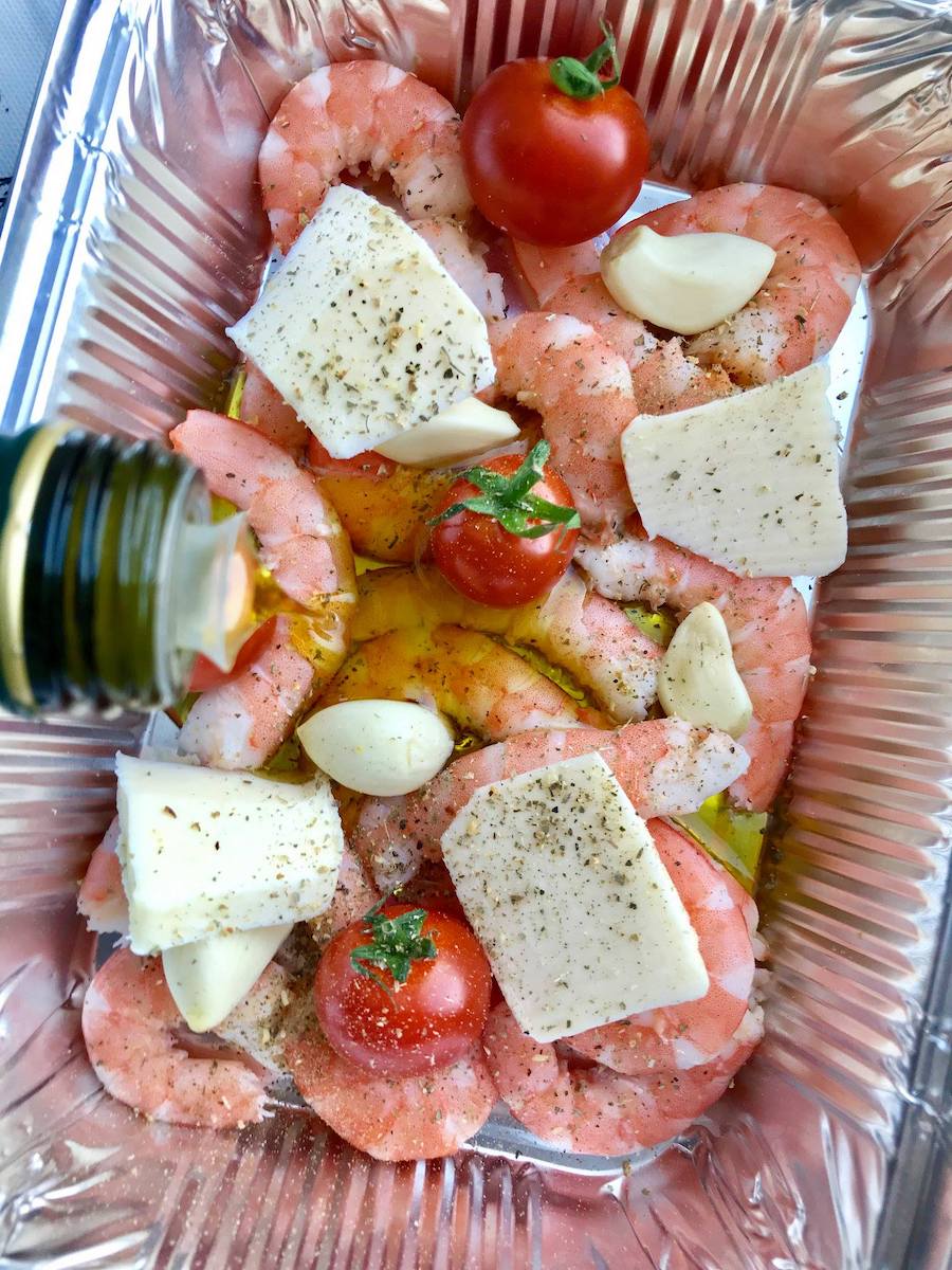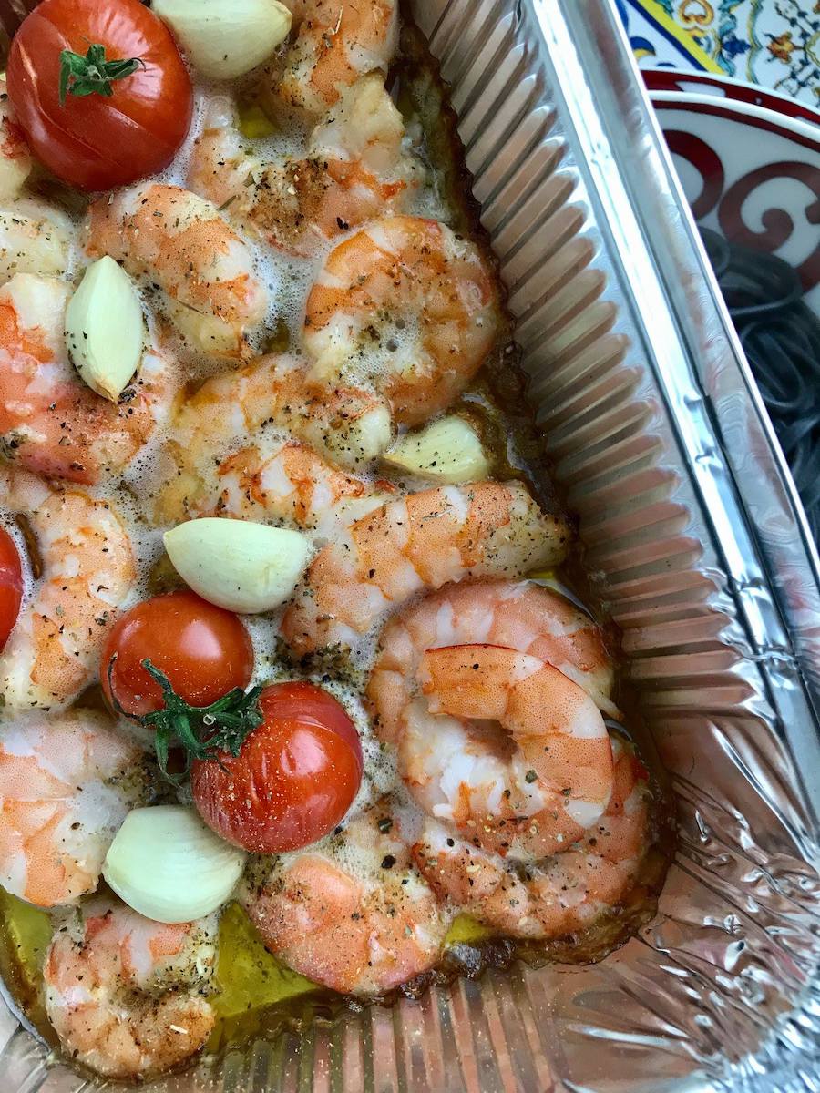 Духовку разогреть до 200 градусов, в кастрюле вскипятить воду для пасты. Креветки очистить, выложить в форму, добавить очищенные зубки чеснока и целые помидоры черри, сбрызнуть оливковым маслом, сверху положить небольшие кусочки сливочного масла, приправить солью и перцем. Образовавшийся сок будет нашим соусом к пасте. Отправить форму в духовку на 12 минут.
