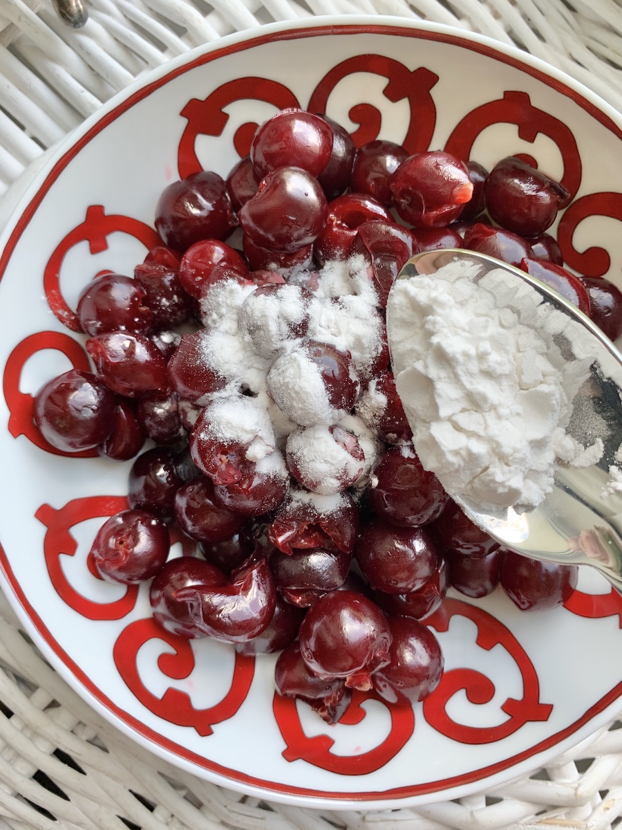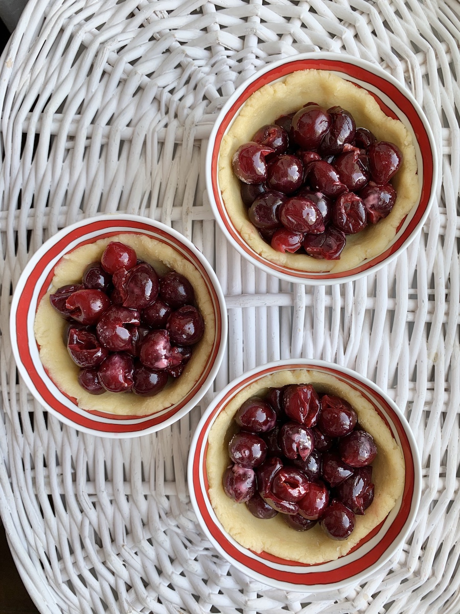 Итак, на 3 порции берем: 100 г холодного сливочного масла, 180-200 г муки, 1 яйцо, 50 г сахара, щепотку соли, 1/2 чайной ложки разрыхлители, 3 капли ванильной эссенции. Для начинки: 3 горсти вишни, 1 столовая ложка крахмала, 1 столовая ложка сахара.