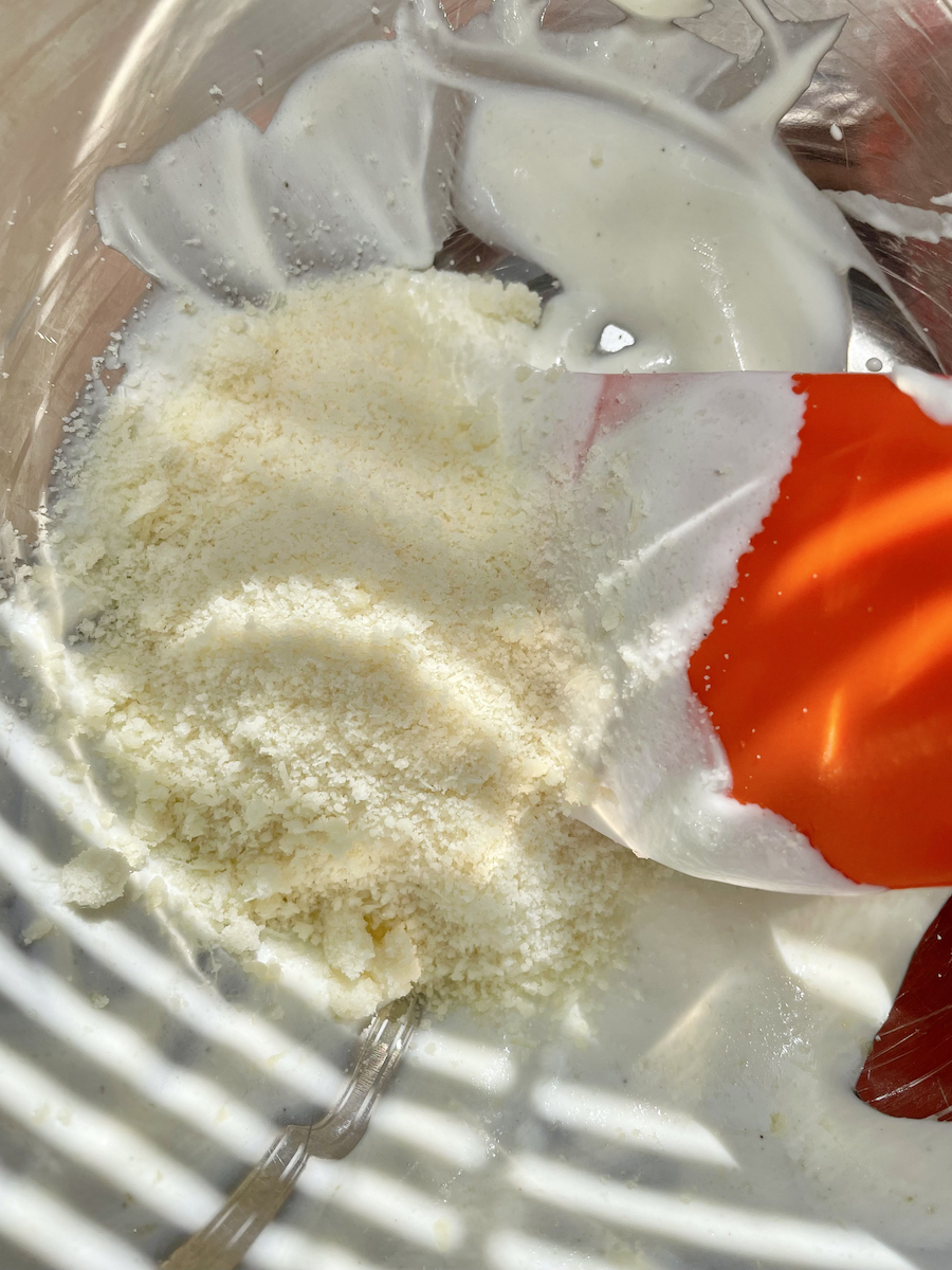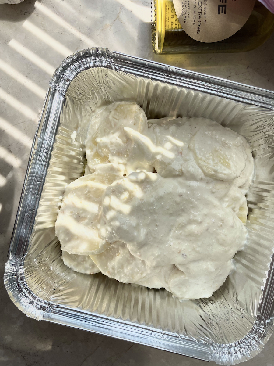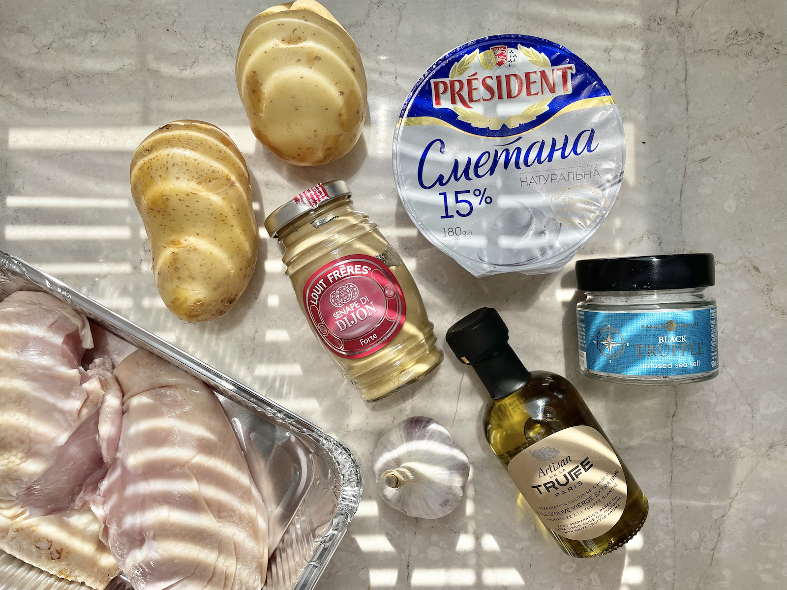 Итак, берем 2 грудки фермерской курицы, 2 средних картофелины, 2 чайные ложки горчицы, столовую ложку трюфельного масла, чайную ложку трюфельной соли, зубок чеснока, 30 г натертого пармезана, помидоры черри для подачи.