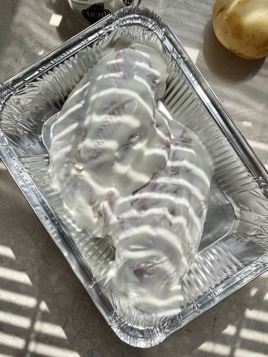 Духовку разогреть до 185 градусов. В миске смешать сметану, масло, соль, горчицу, измельченный зубок чеснока и пармезан. Грудки вымыть и обсушить, обмазать сметаной и положить в форму для запекания. Отправить в духовку на 30 минут.
