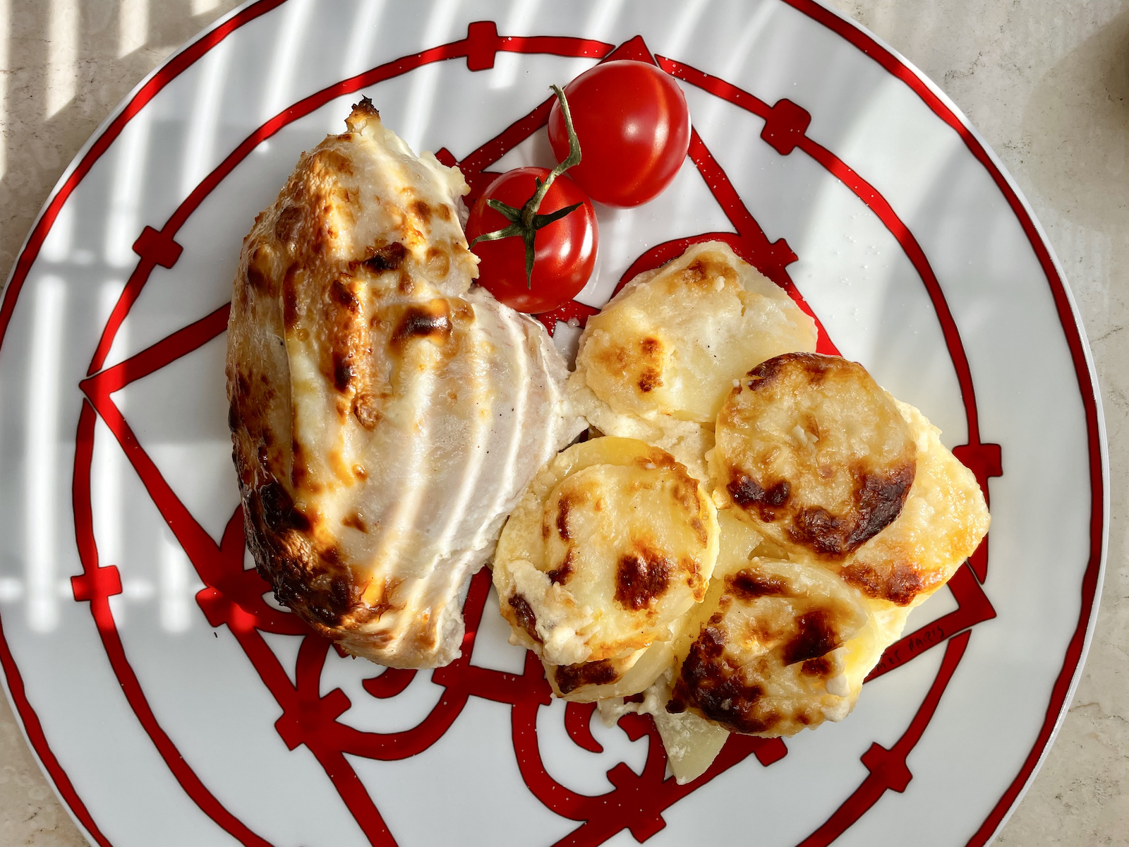 Картофель очистить и нарезать тонкими кольцами, отправить в миску со сметаной и хорошо перемешать. Выложить картофель слоями в небольшую форму для запекания и отправить в духовку на 30-40 минут до полной готовности. Как только все составляющие блюда будут готовы, сервировать грудку с картофелем, добавить пару помидоров черри и немедленно подать.