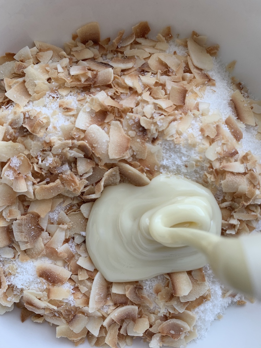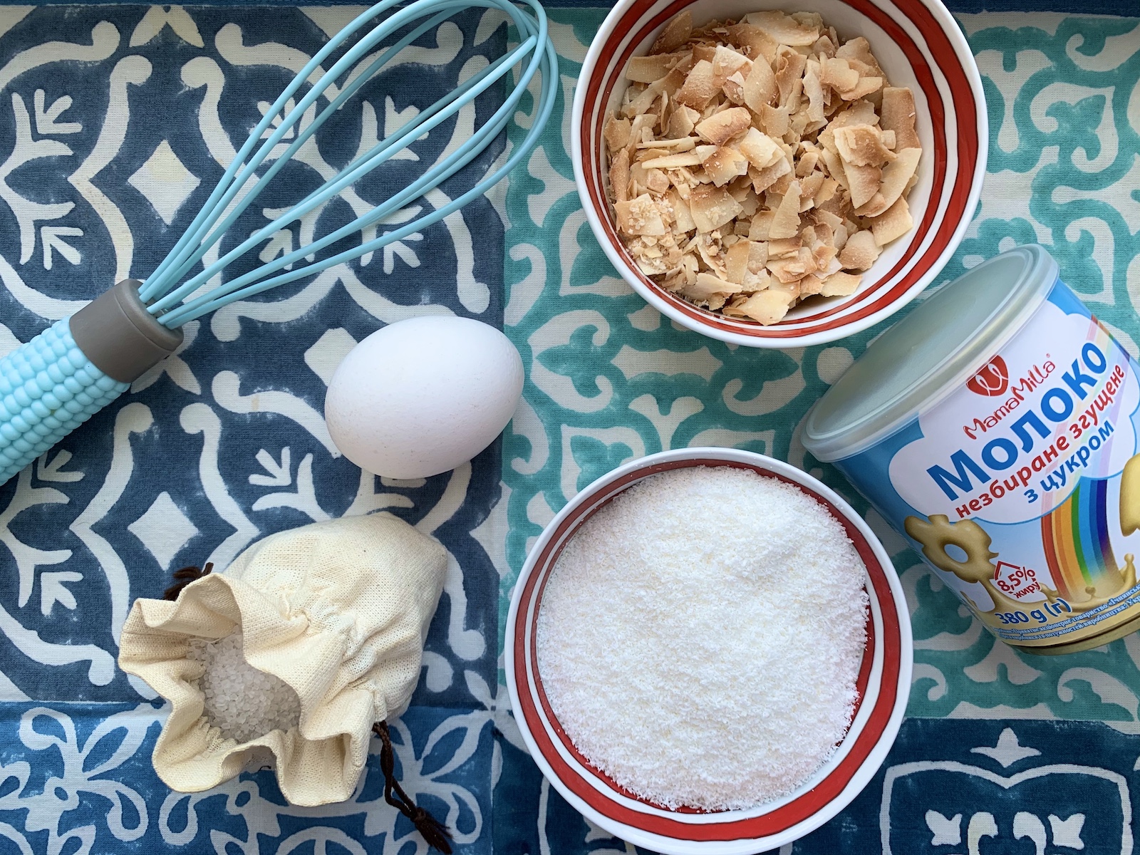 Итак, на 2 дюжины печенья берем: 200 г кокосовой стружки или кокосовых чипсов, 350 г сгущенного молока, щепотку соли, несколько капель ванильного экстракта, 1 взбитый до мягких пиков белок.