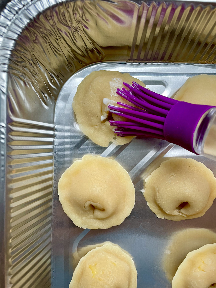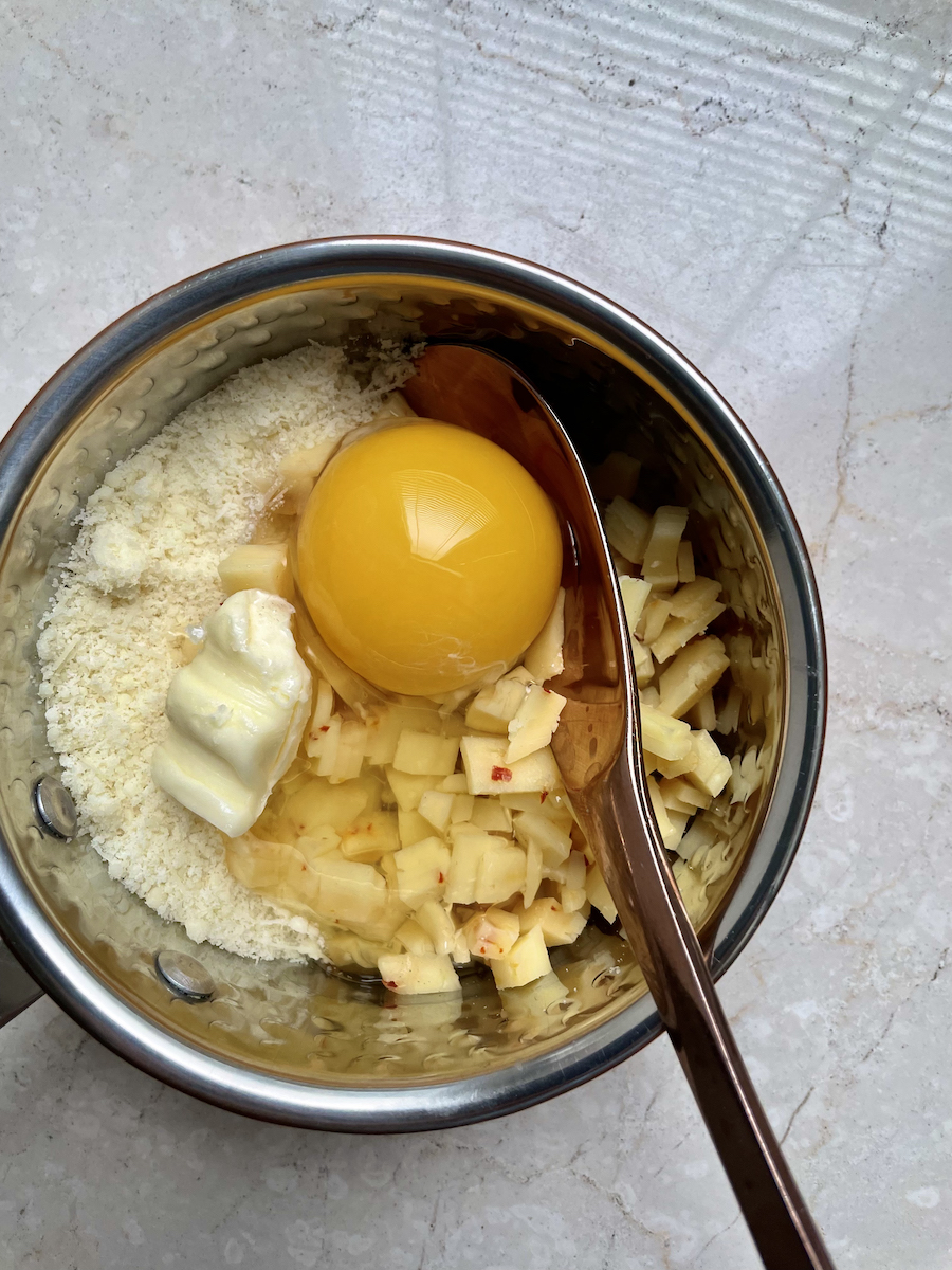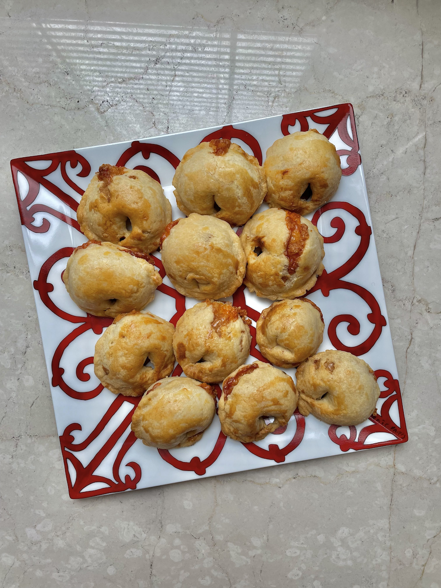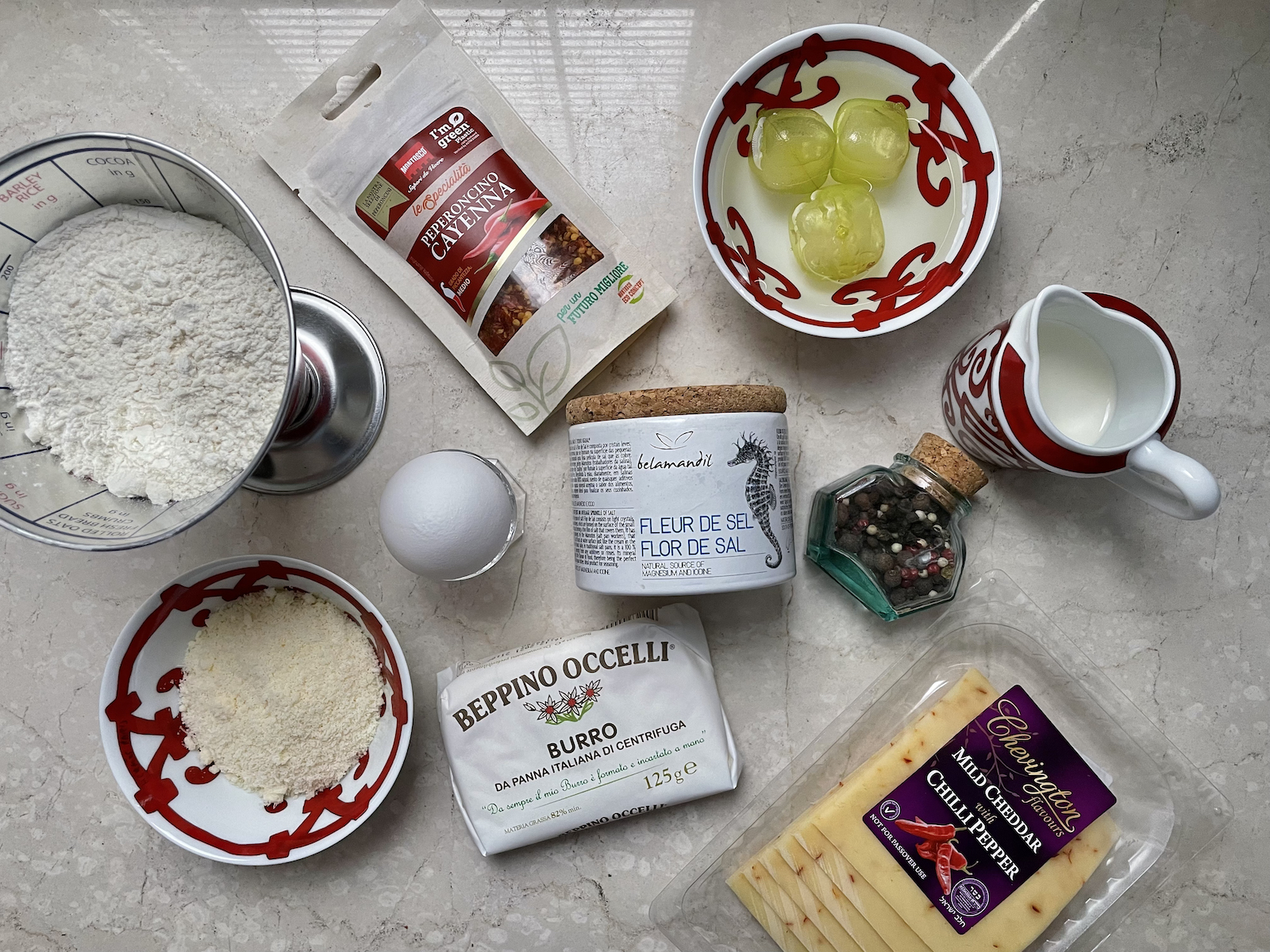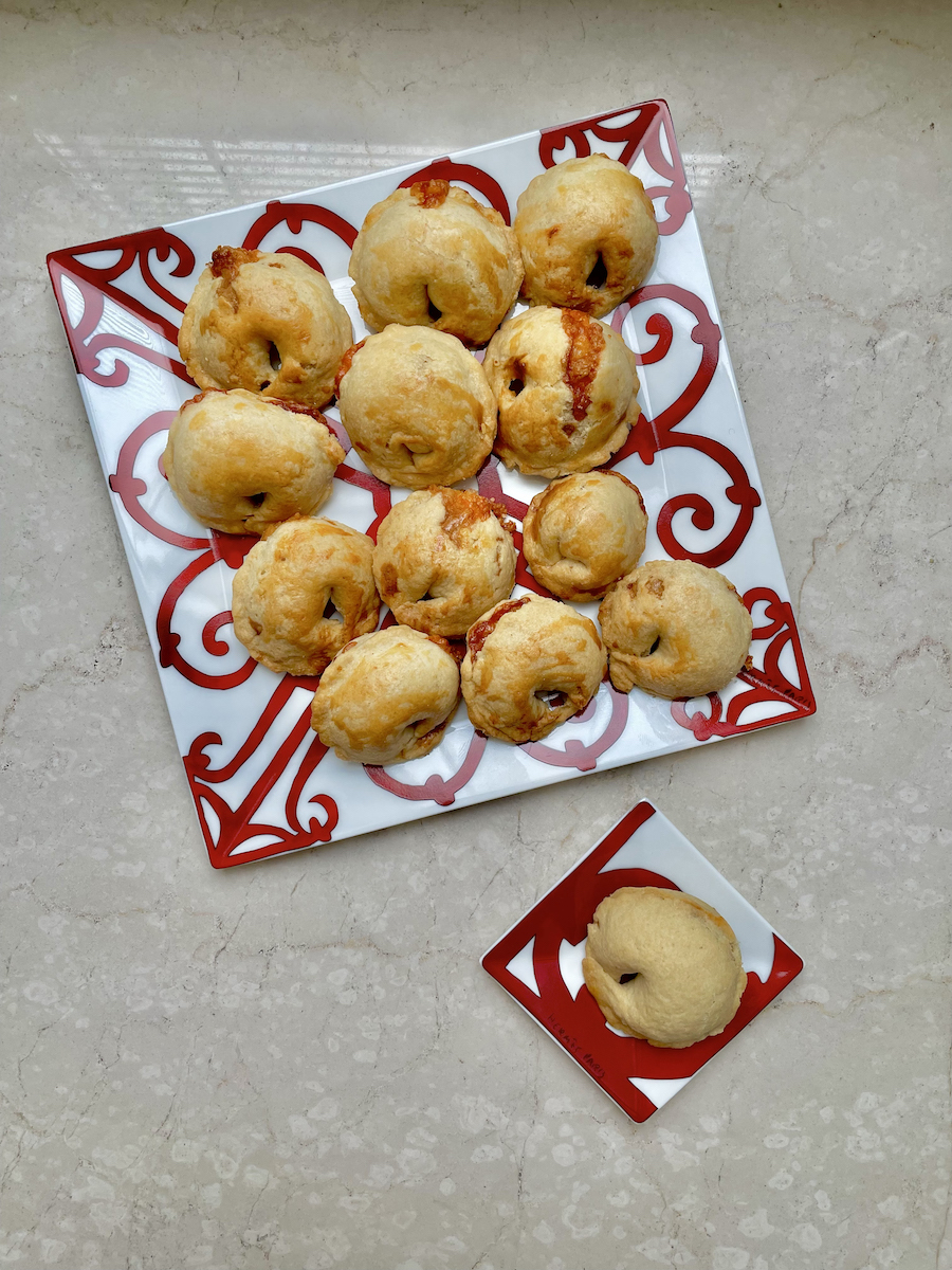 Итак, на 20 сырных буше берем: 170 г муки, 3-5 столовых ложек ледяной воды, 90 г охлажденного сливочного масла, щепотку соли. Для начинки: 1 яйцо, 30 г сыра чеддер, 40 г пармезана, чайную ложку сливочного масла, щепотку кайенского перца, немного соли и свежемолотого черного перца, молоко для смазывания печенья.