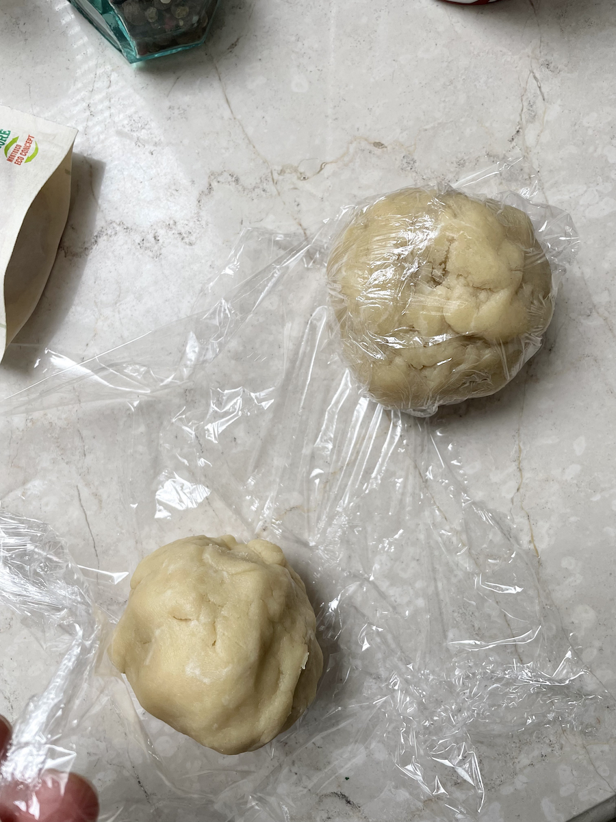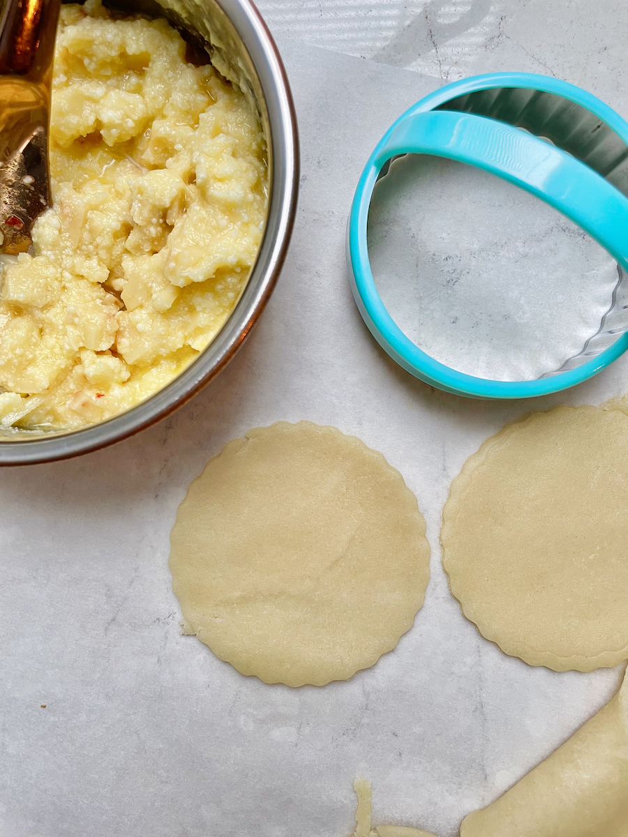 Духовку разогреть до 200 градусов. В чашу комбайна просеять муку, добавить масло, нарезанное кубиками, соль. Перемешивать до образования мокрой крошки. Добавить ледяную воду и замесить эластичное тесто, разделить его на две части, скатать в шарики, обернуть пищевой пленкой и отправить в холодильник на 20 минут. Для начинки натереть или мелко нарезать сыры, добавить яйцо, растопленное сливочное масло, соль, кайенский и черный перец, хорошо перемешать.