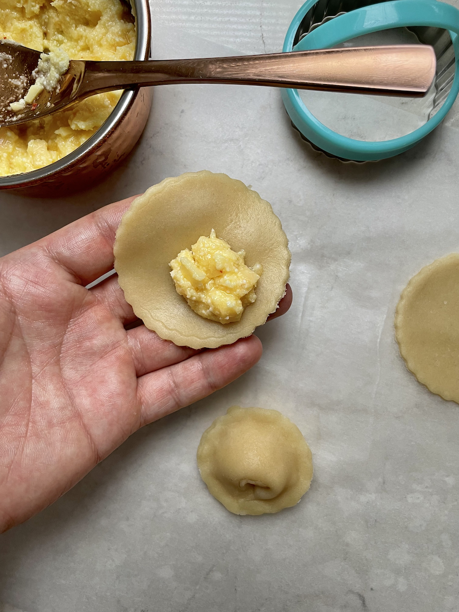На подготовленной поверхности раскатать тесто лощиной не более 2 мм, вырезать круги диаметром 8-10 см с помощью стакана или кулинарного кольца. На каждый круг положить чайную ложку начинки, слепить полумесяц, хорошо прижав края, и соединить углы. Выложить в форму для запекания, смазать небольшим количеством молока. Отправить в разогретую духовку на 22-26 минут. Достать печенье, подавать в остывшем виде.