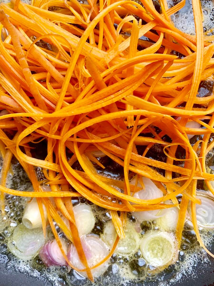 Морковь натереть на специальной терке, превратив в спагетти (или же нарезать тонкой соломкой), лук нарезать кольцами. В сковороде разогреть сливочное и оливковое масло, пассеровать лук и морковь в течение пяти минут, добавив немного соли.