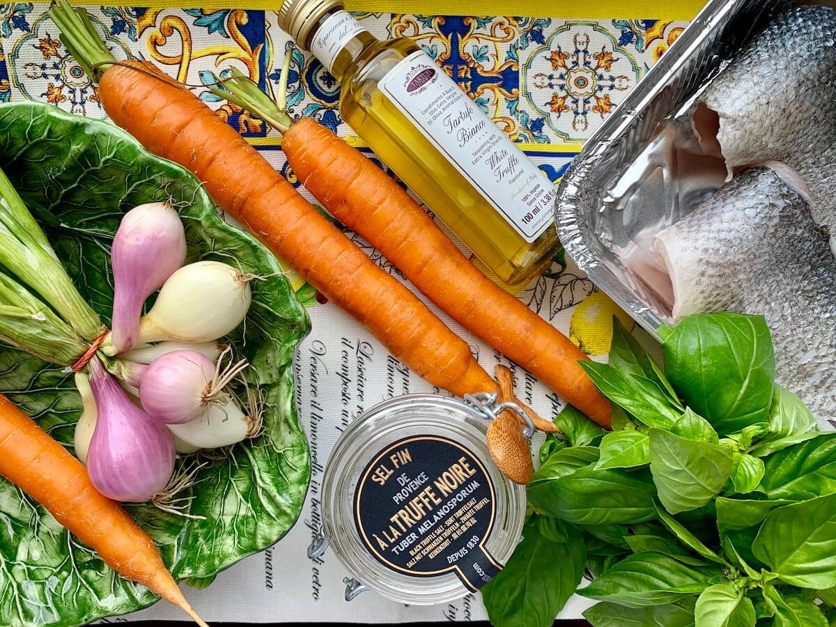 Итак, берем 2 филе дорады, 2 молодые моркови, 4 маленьких молодых луковки, 2 столовые ложки сливочного масла, столовую ложку оливкового масла и еще немного трюфельного, соль, свежемолотый перец или микс пряностей для рыбы.