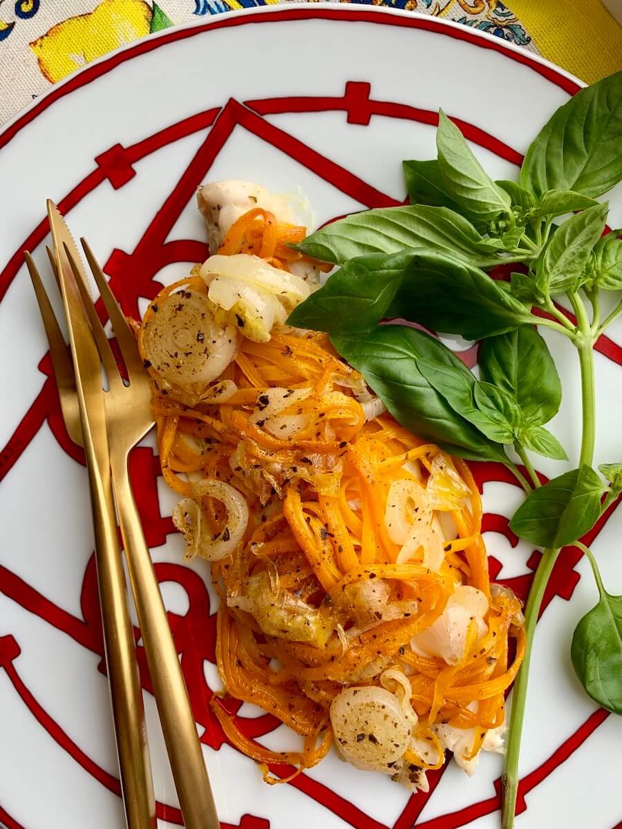 Рецепт выходного дня: Дорада со спагетти из моркови и молодым луком
