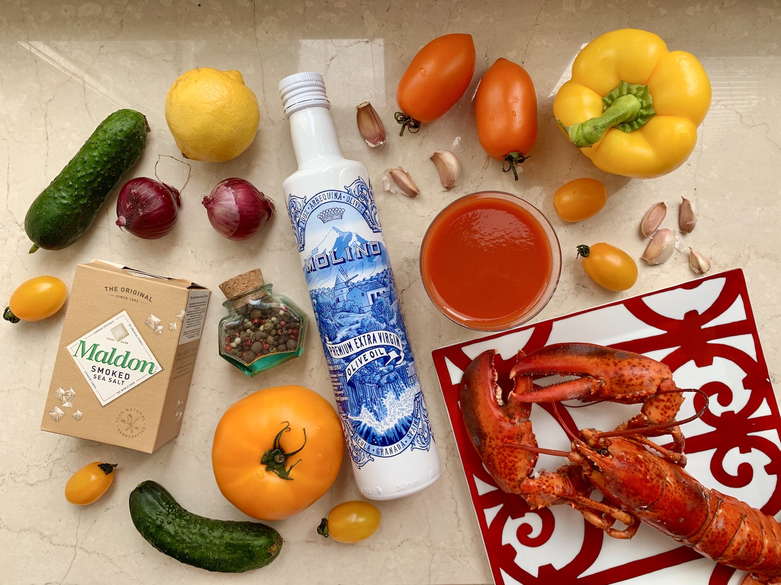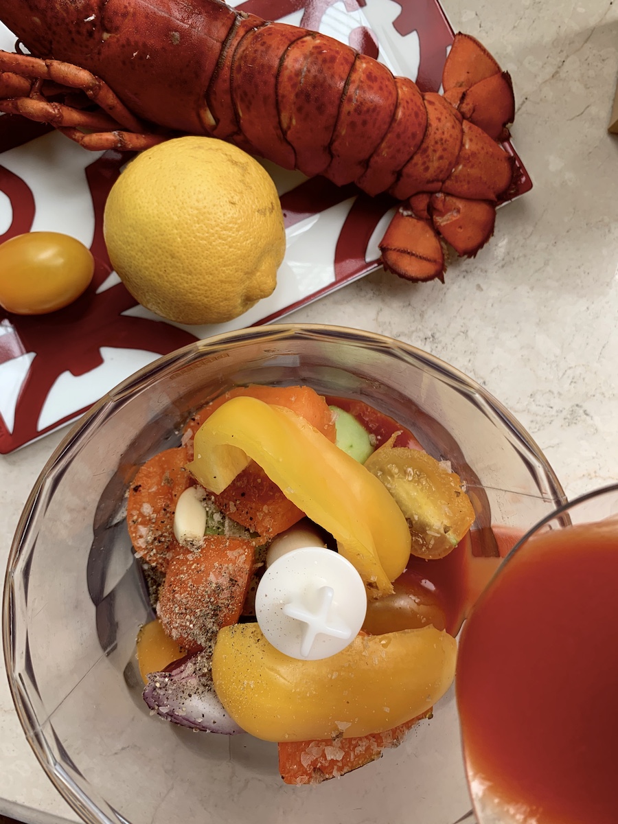 Итак, на 2 порции берем: 1 крупный помидор, пару помидоров-слив и 4-6 черри, 2 зубка чеснока, 1 маленькую красную луковицу, 1 сладкий перец, 2 средних огурца, четверть сока лимона, 50 мл оливкового масла, 200 мл томатного сока, свежемолотый перец, копченую соль и 1-2 готовых лобстера.