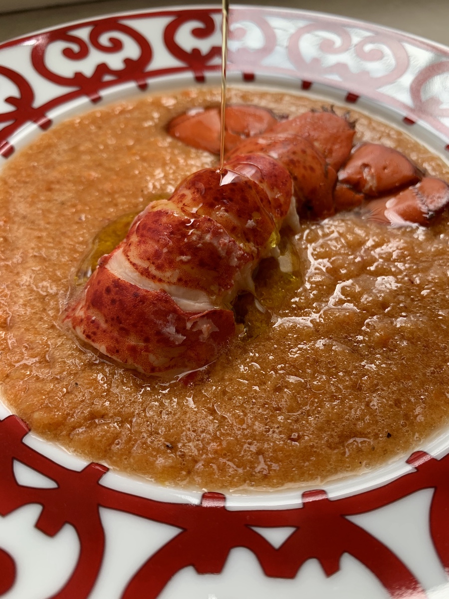 Сезон холодных супов в разгаре! Сейчас, когда овощи особенно ароматны и вкусны, самое время приготовить гаспаччо. К нему я добавляю мясо лобстера (не нужно падать в обморок – средний готовый лобстер стоит 300 грн в Le Silpo) и копченой соли для яркости вкуса. Лобстера можно заменить креветками или раками.