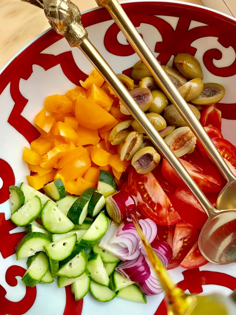 Итак, берем 4-5 помидоров, 1 большой сладкий перец, 2-3 огурца, небольшую красную луковицу, две горсти оливок, 200 г феты, оливковое масло. Для яркости вкуса можно добавить свежемолотый перец и бальзамический крем.