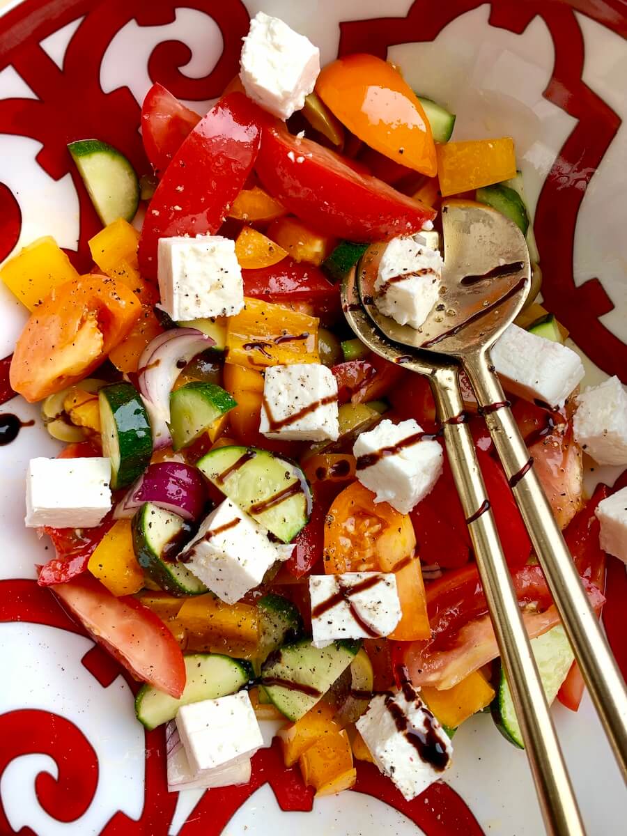Овощи нарезать в миску, приправить оливковым маслом и хорошо перемешать. Сверху положить кубики феты и сбрызнуть бальзамическим кремом. Немедленно подать с бокалом белого сухого.