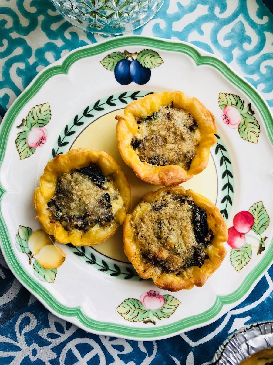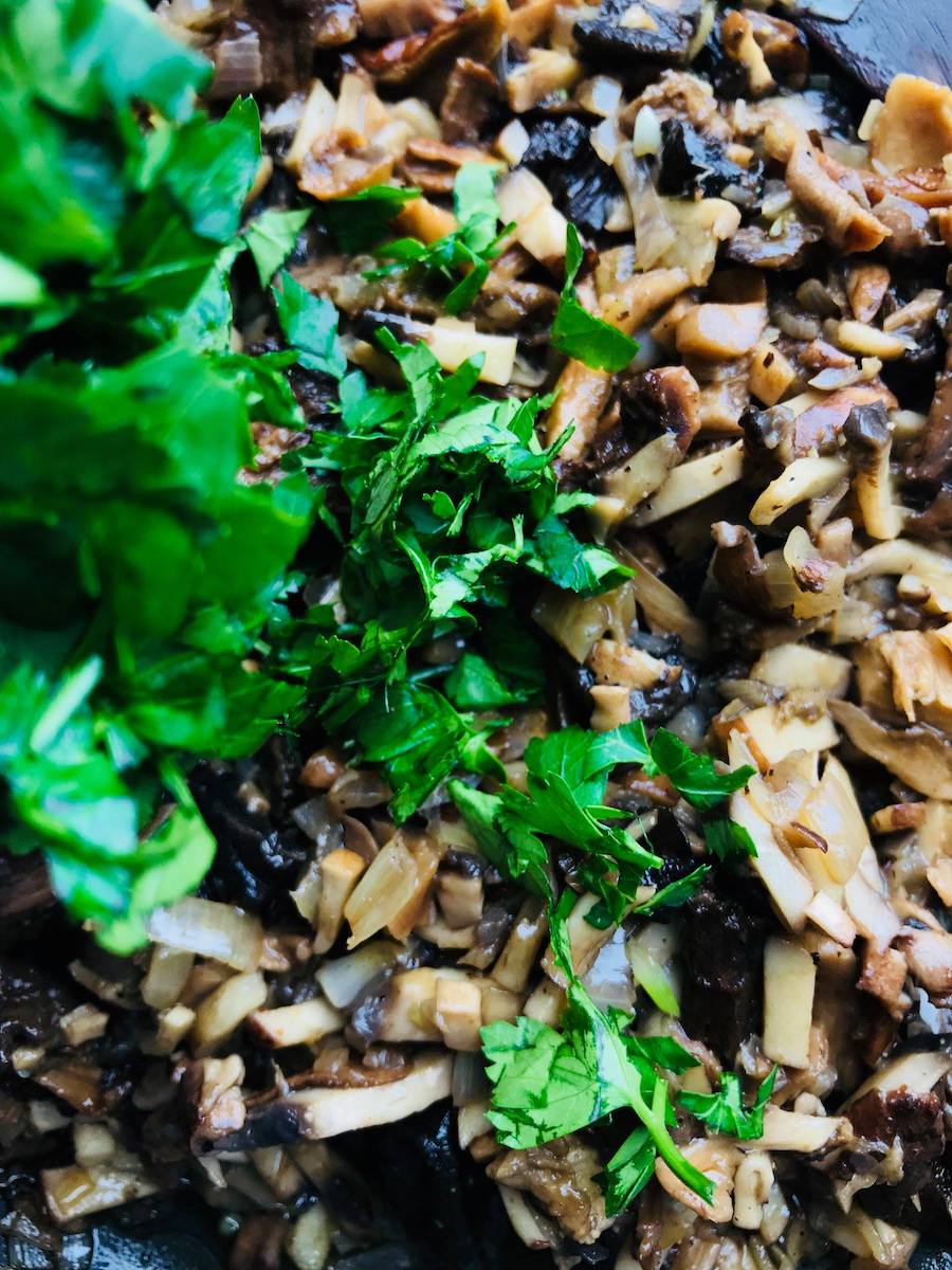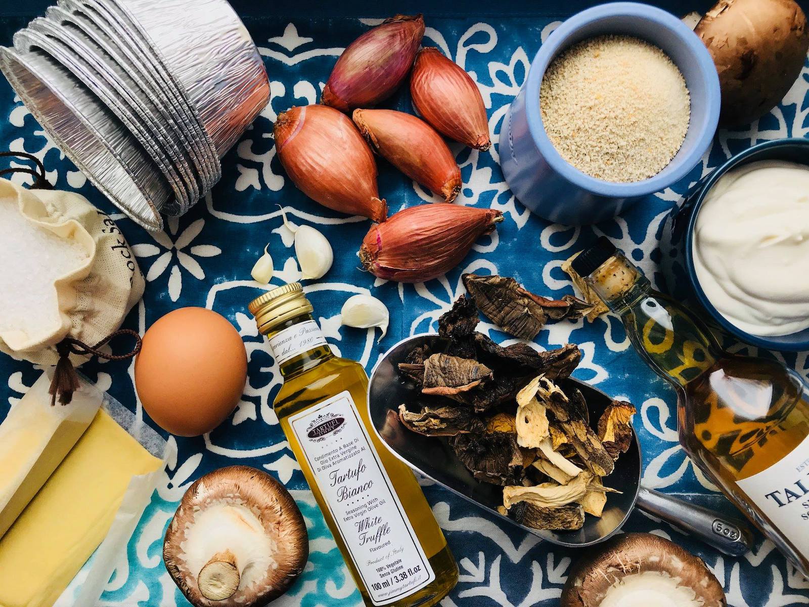 Итак, берем: 2 листа живого слоеного теста (на 20 пирожков), 4 луковицы-шалот, 2 зубка чеснока, горсть сушеных белых грибов, 3 больших шампиньона, 150 г домашней сметаны, 2 желтка, соль, свежемолотый перец, немного пармезана и панировочных сухарей, 1 столовую ложку виски, трюфельное масло, оливковое и сливочное масло, горсть рубленой петрушки.