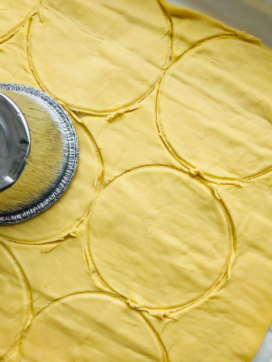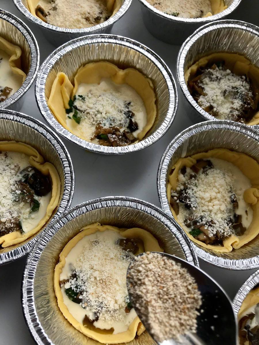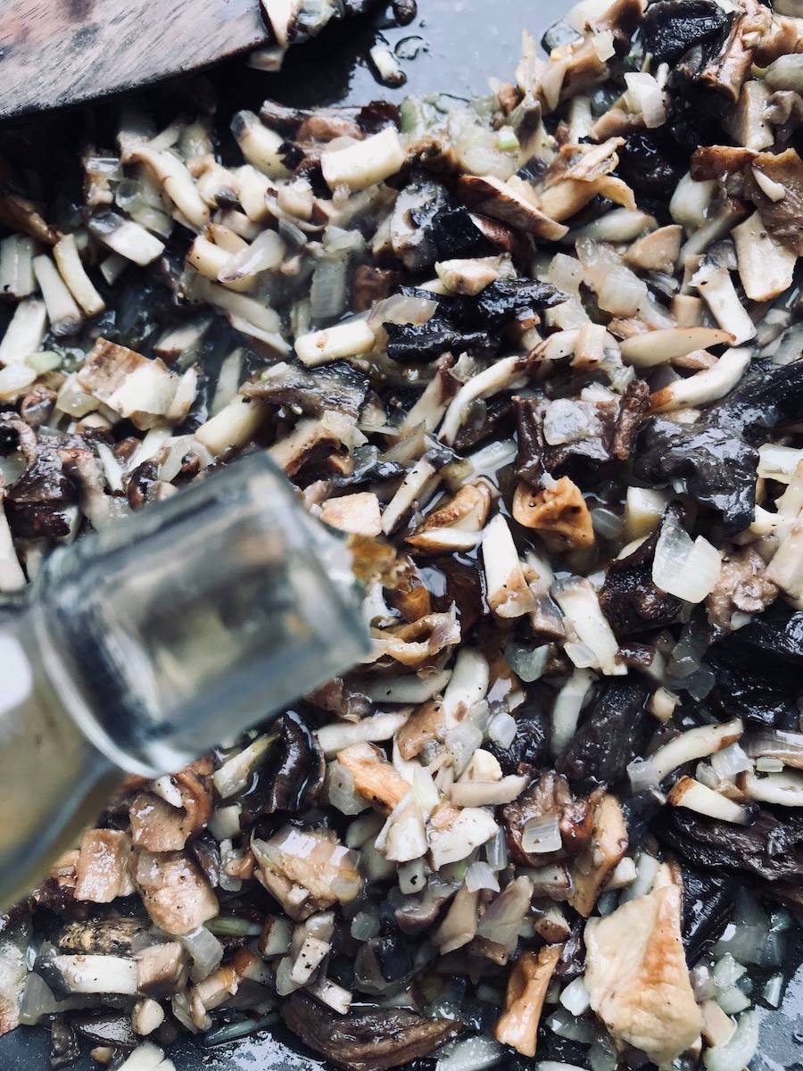 Итак, берем: 2 листа живого слоеного теста (на 20 пирожков), 4 луковицы-шалот, 2 зубка чеснока, горсть сушеных белых грибов, 3 больших шампиньона, 150 г домашней сметаны, 2 желтка, соль, свежемолотый перец, немного пармезана и панировочных сухарей, 1 столовую ложку виски, трюфельное масло, оливковое и сливочное масло, горсть рубленой петрушки.