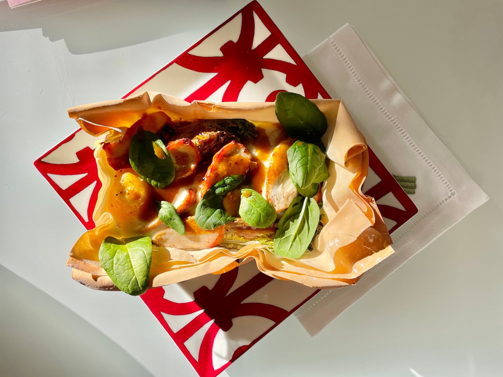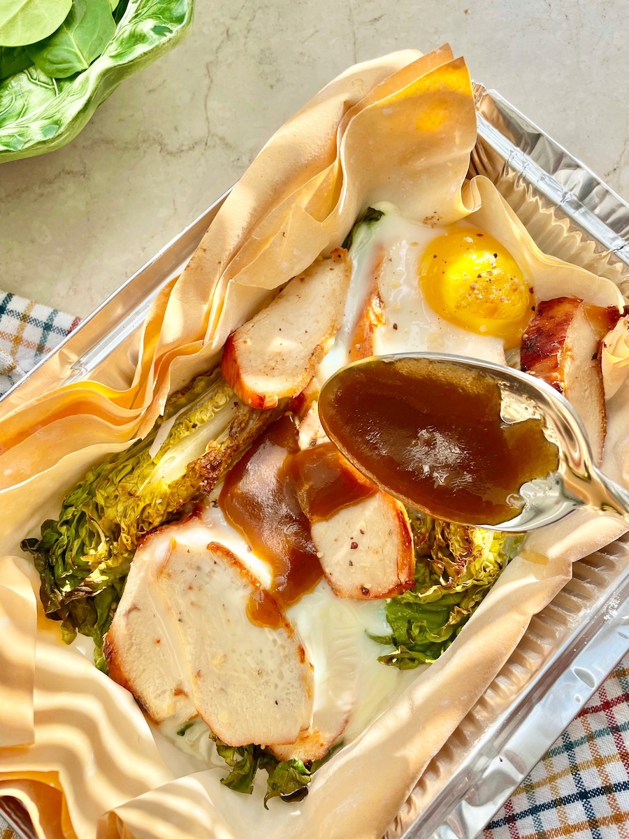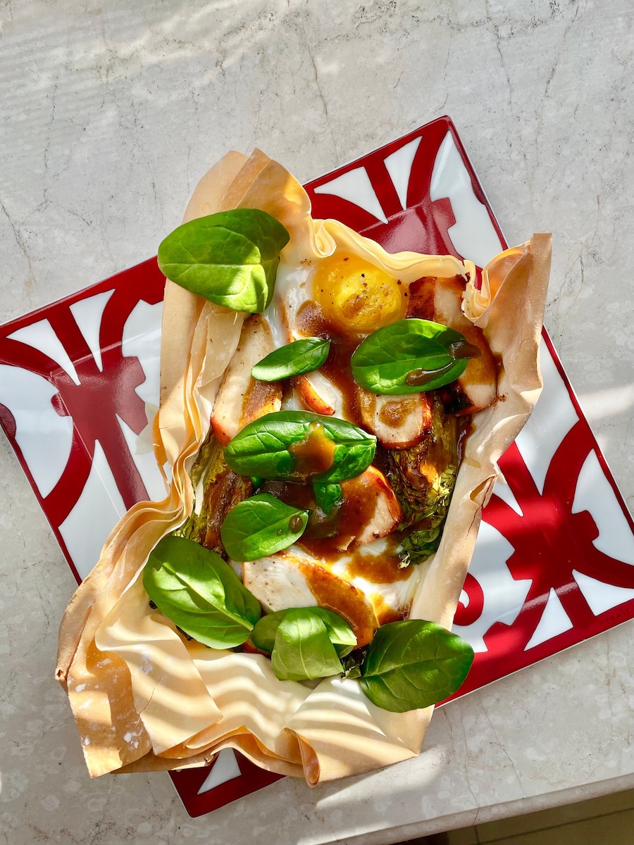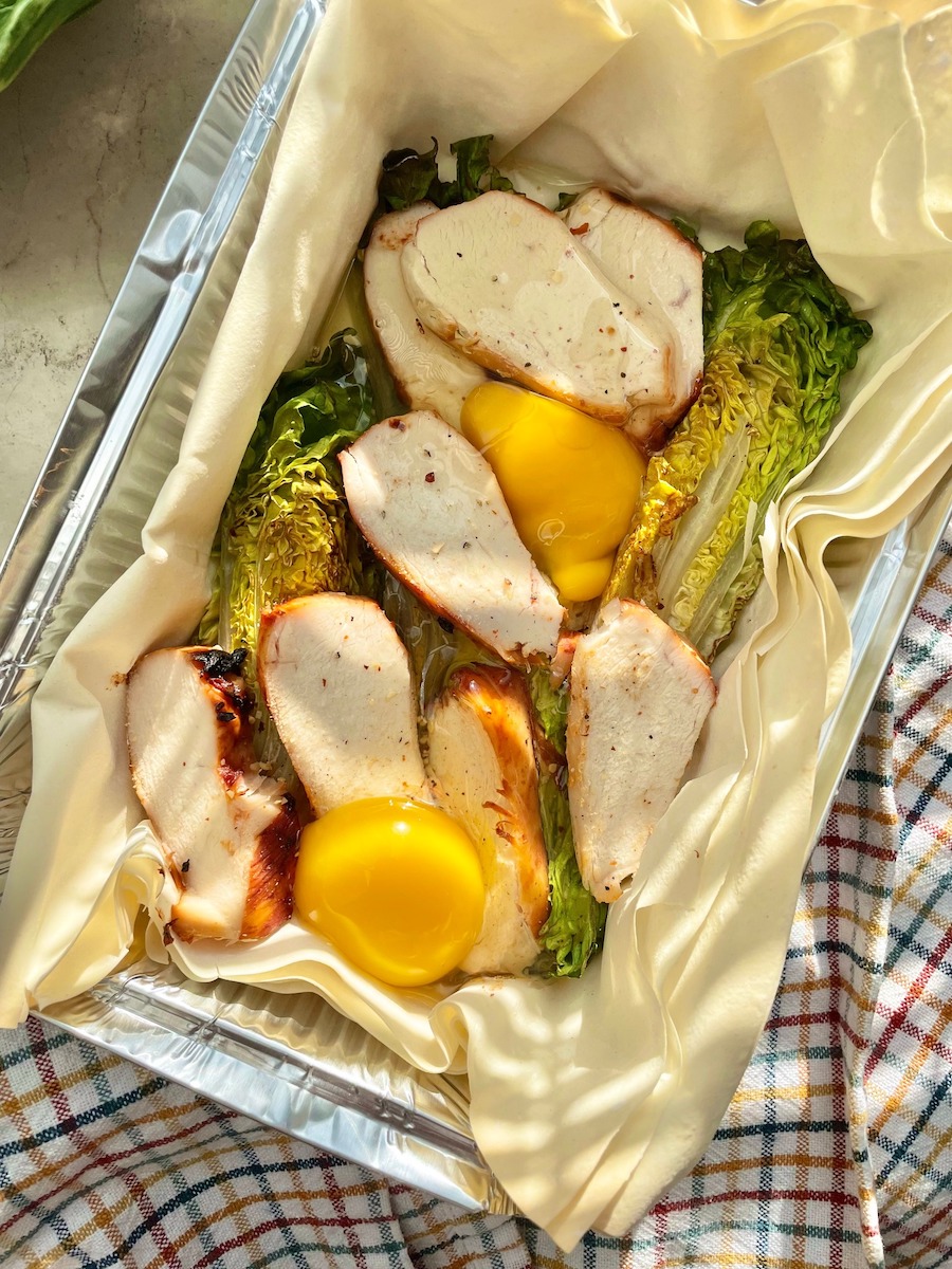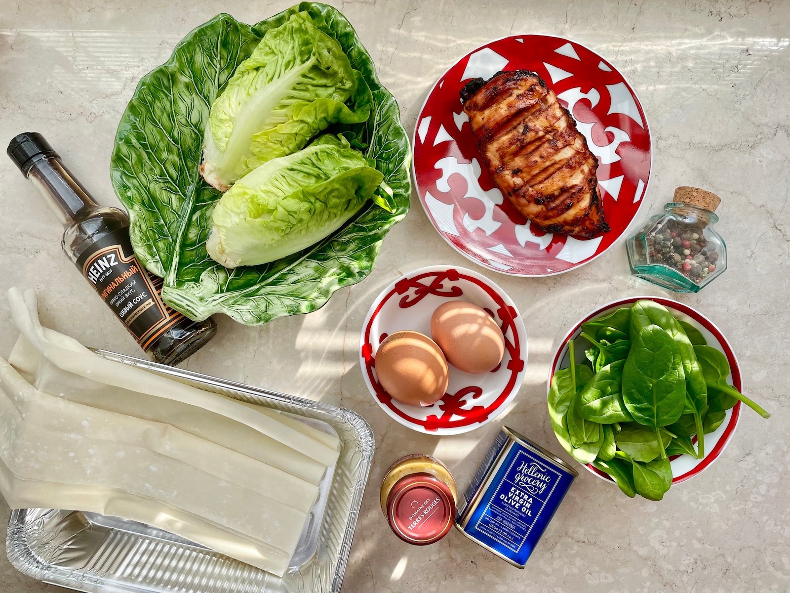Итак, для пирога на двоих берем: 2 листа теста фило, 1 куриное филе (заранее приготовленное на гриле, обжаренное на сковороде или запеченное в духовке), 2 кочана римского салата, 2 яйца, горсть листьев свежего шпината. Для заправки: 2 столовые ложки оливкового масла, 1 чайная ложка горчицы (поищите интересную, у меня – с инжиром), 1 чайная ложка сладко-пряного соевого соуса, свежемолотый перец.