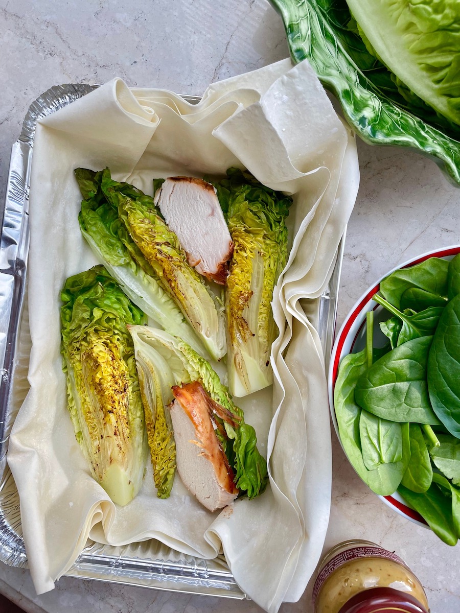 Духовку разогреть до 200 градусов. В форму для запекания выложить сложенные вдвое листы теста фило. Салат разрезать на 4 части и подрумянить на сухой сковороде с каждой стороны. Филе нарезать небольшими ломтиками. Римский салат и курицу выложить в форму, распределив равномерно, немного приправить солью и перцем, отправить в духовку на 10 минут.