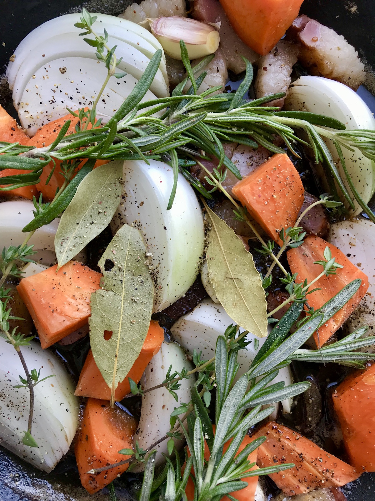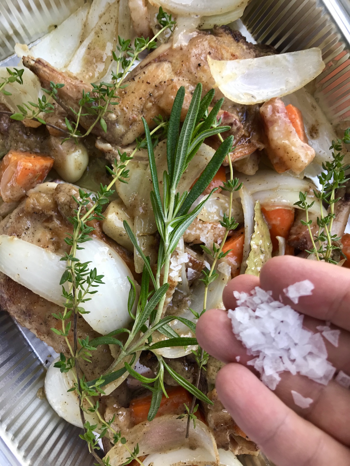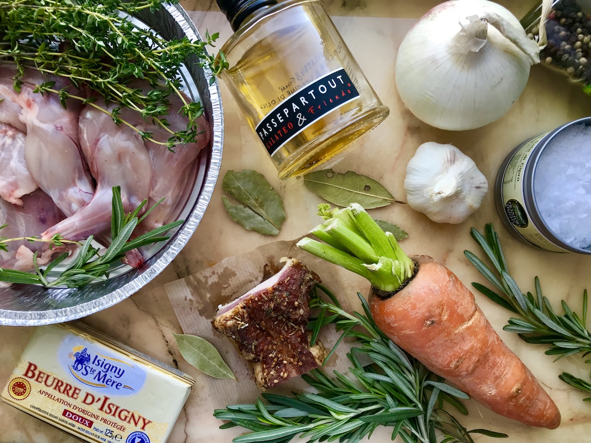 Итак, берем 3 средние лапки кролика, одну большую луковицу, одну большую морковь, 5 зубков чеснока, пучок тимьяна, 3 веточки розмарина, 150 мл белого сухого вина, горсть муки, соль, свежемолотый перец, оливковое и сливочное масло, 150 г пряного сала, лавровый лист.