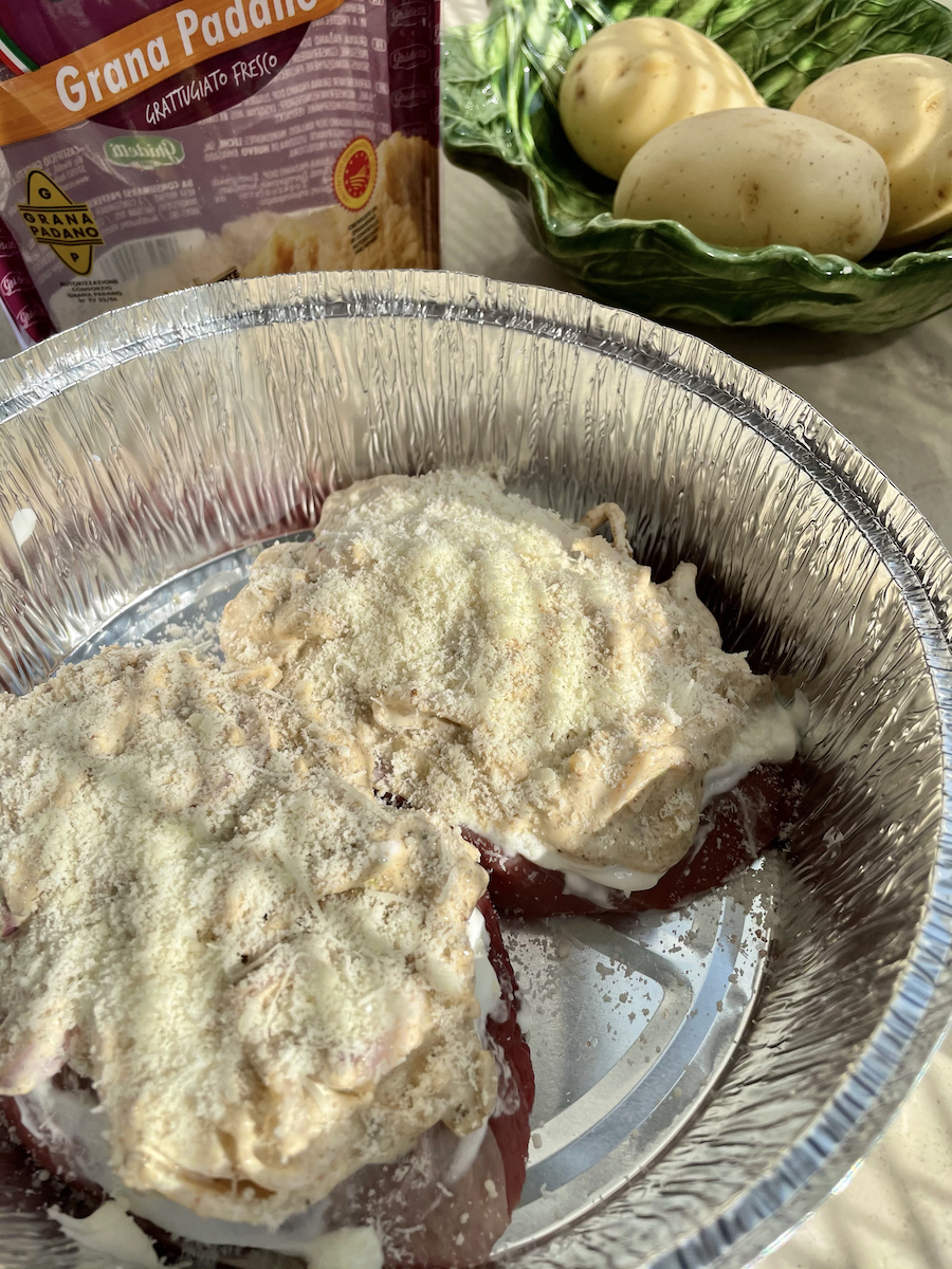 На 2 порции берем: 2 небольших телячьих битка или стейка, 2-3 молодых картофелины, 3 лука-шалот, 2 зубка чеснока, сметану, пыль из сушеных белых грибов, топленое масло, соль, свежемолотый перец, микс пряностей для мяса, несколько веточек петрушки, 2 столовые ложки тертого пармезана или грано падано. Для подачи – соленья и бородинский хлеб.