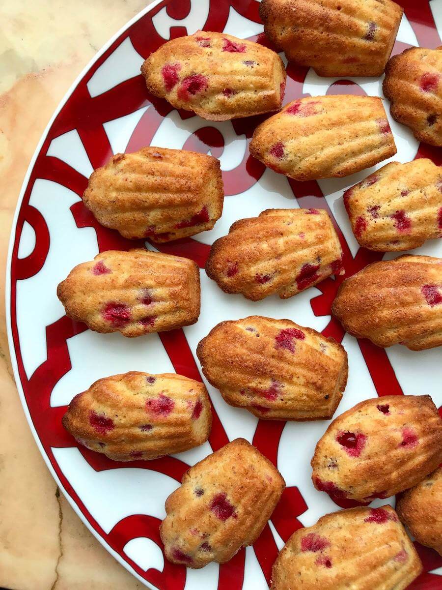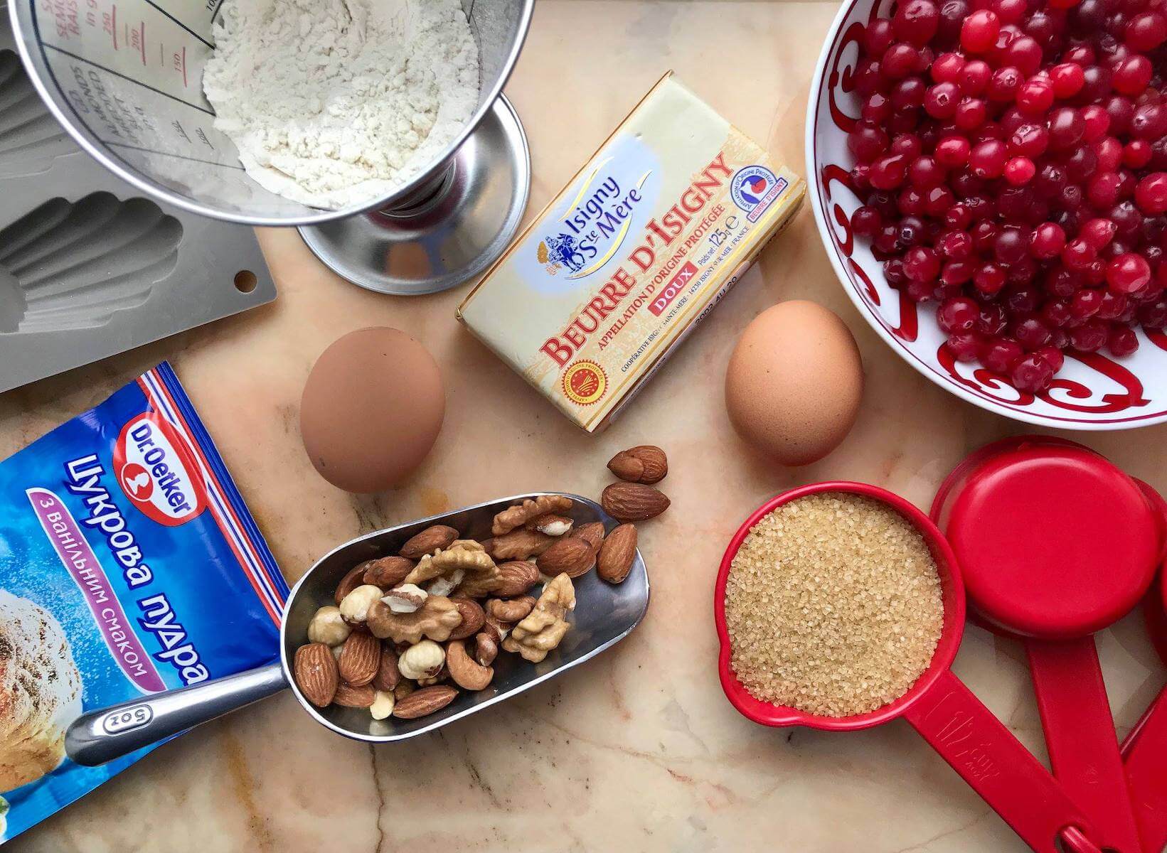 Духовку предварительно разогреть до 180 градусов. Масло растопить на небольшом огне, яйца взбить с сахаром и ванильным экстрактом в пышную массу. В яичную смесь добавить пшеничную и ореховую муку, разрыхлитель, тонкой струйкой влить растопленное масло и хорошо перемешать. Последней добавить клюкву и еще раз перемешать, сохраняя ягоды целыми. В специальные формы для мадлен в виде ракушек выложить тесто и выпекать 12 минут.