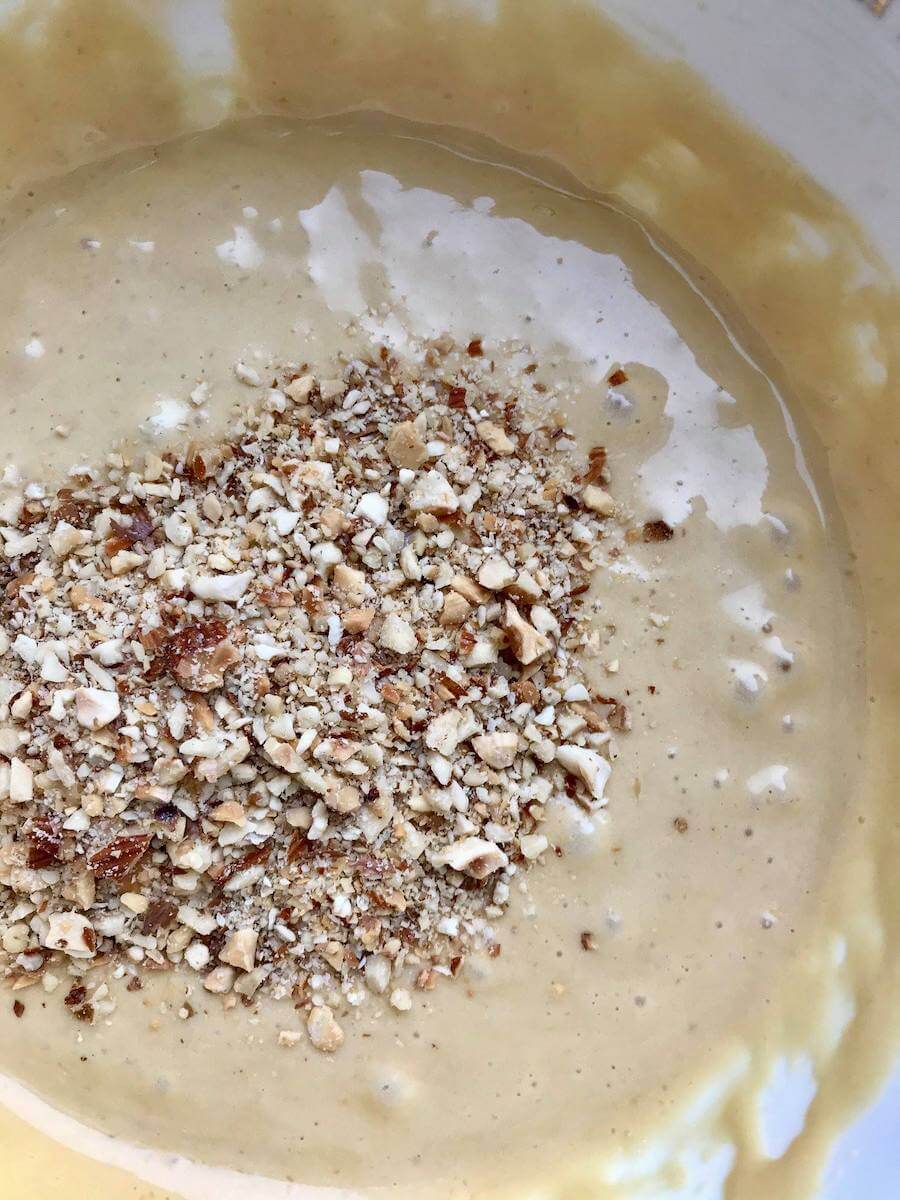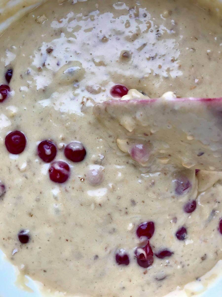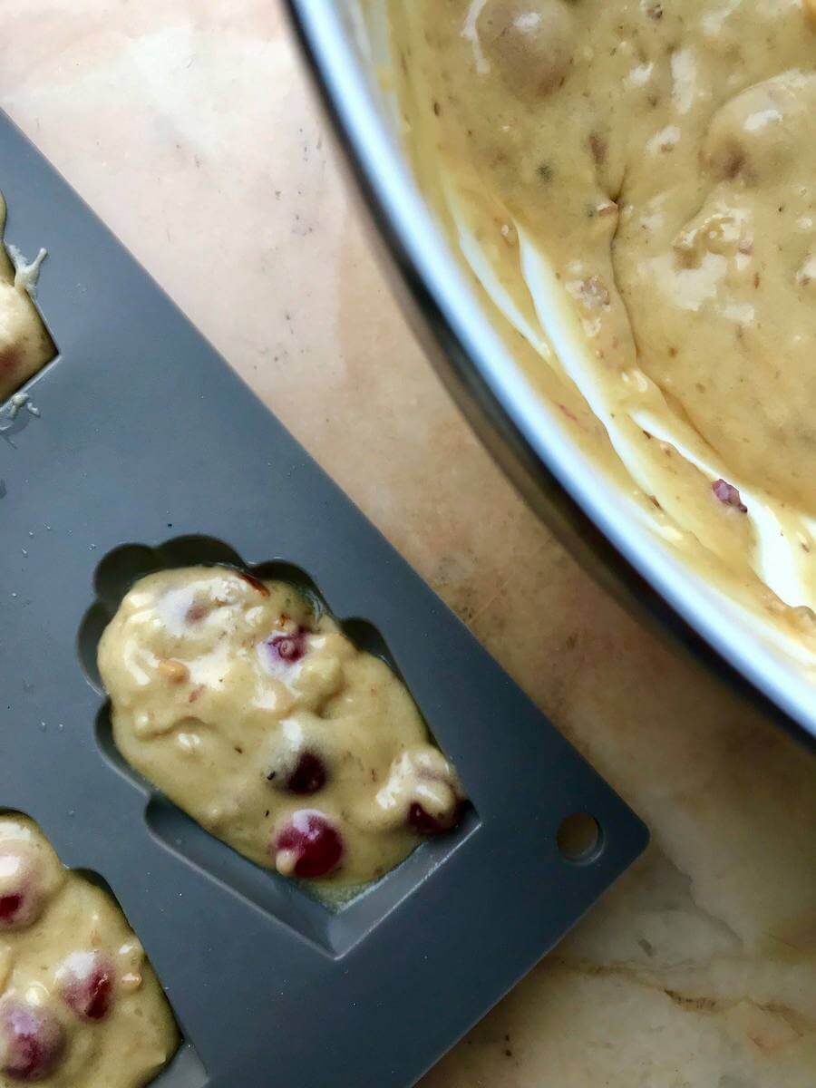 Итак, берем 70 г муки, 30 г разных подсушенных орехов (предварительно превратить в муку), 2 яйца, 100 г сахара, 80 г сливочного масла, 1/2 ч.л. разрыхлителя, 1/2 ч.л. ванильного экстракта, 6 столовых ложек свежей клюквы, сахарная пудра – по желанию.