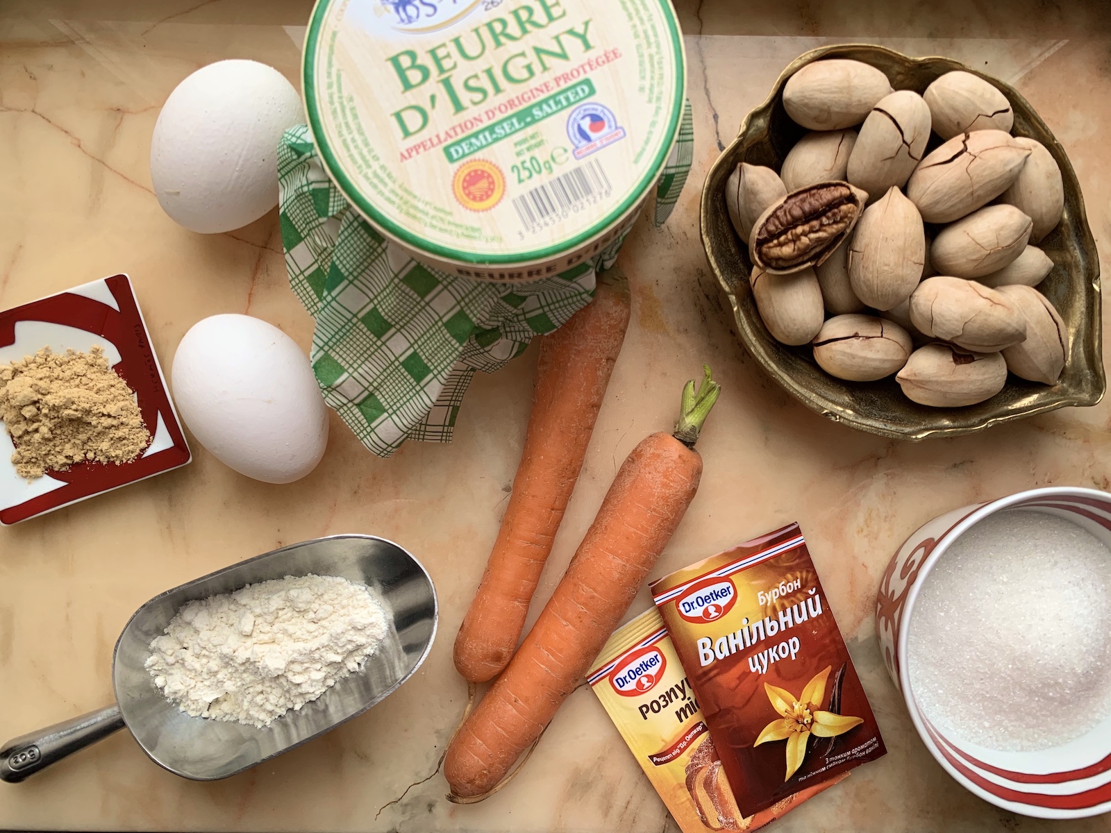 Итак, берем 100 г муки, 70 г орехов пекан (измельчить в муку), 2 яйца, 100 г сахара, 80 г сливочного масла, ½ ч. л. разрыхлителя, 1 ч. л. пудры из имбиря, 1 небольшую морковь.