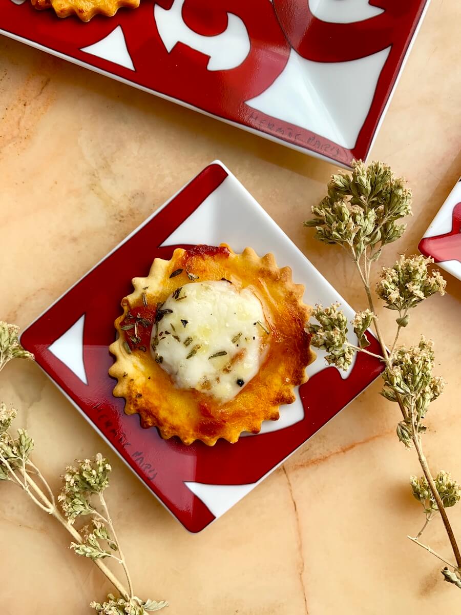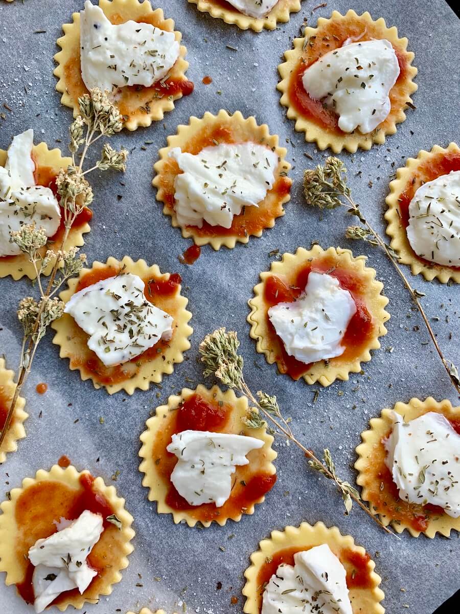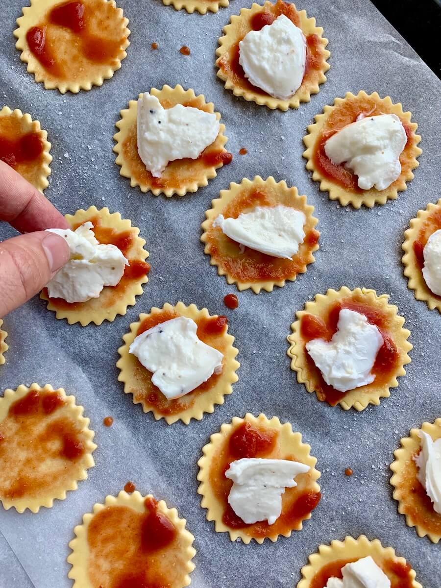 Духовку разогреть до 180 градусов. С помощью небольшого кулинарного кольца подготовить основы для пиццы, выложить их на противень. Каждый круг теста смазать томатом, приправить солью, сверху положить небольшие кусочки моцареллы и посыпать сушеными травами.