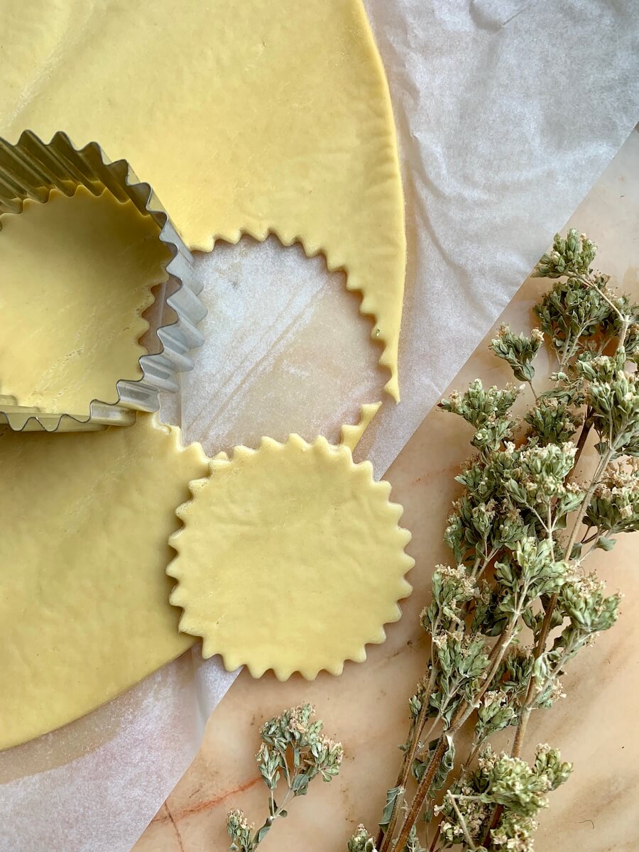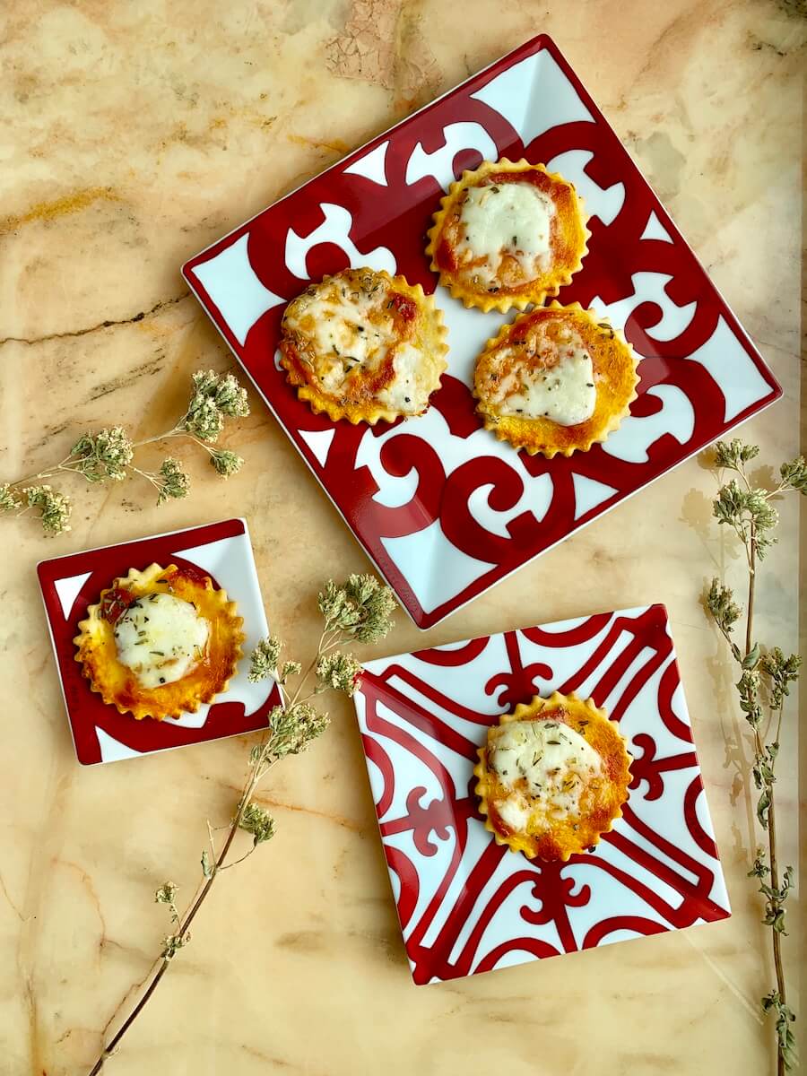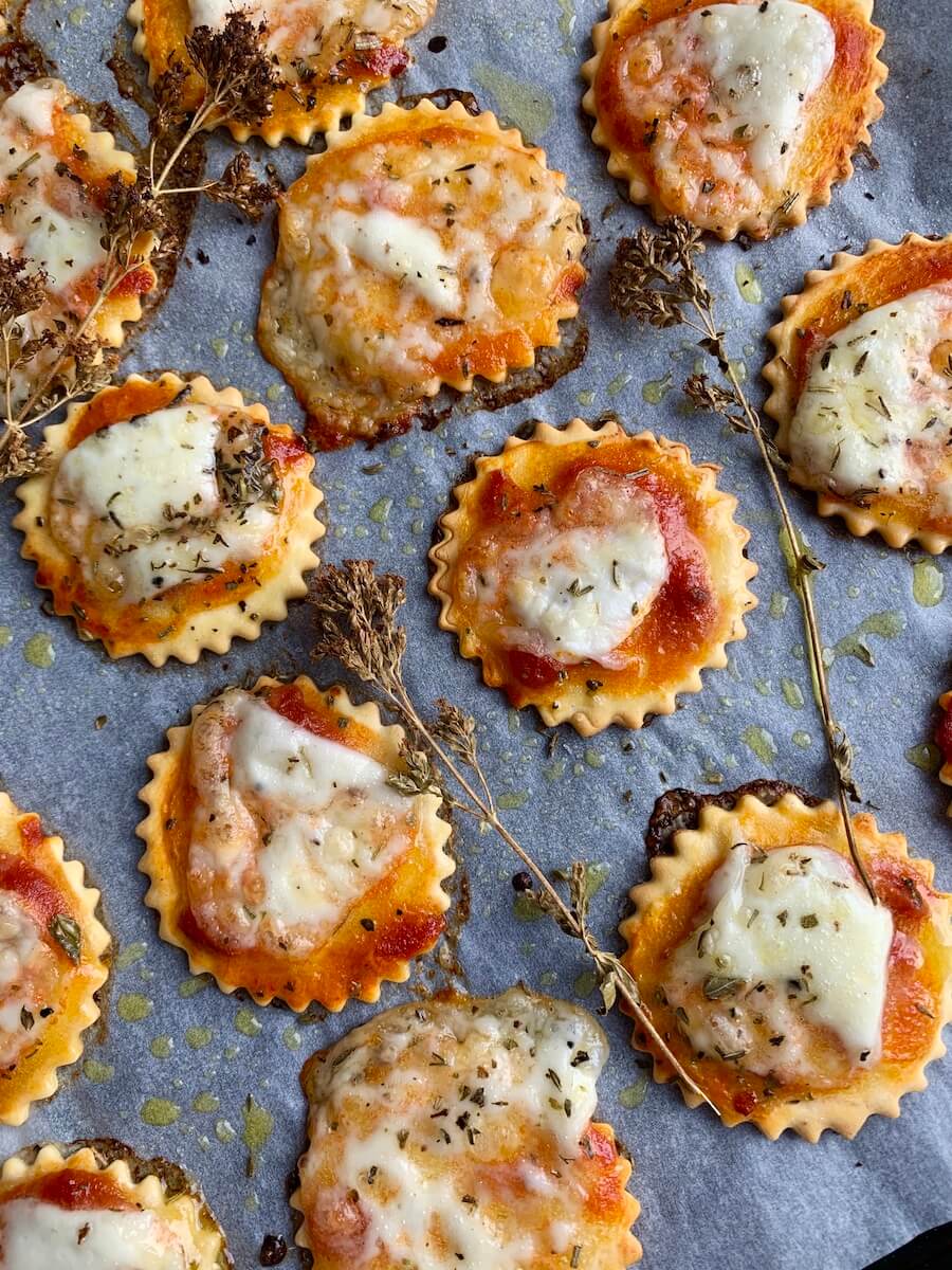 Духовку разогреть до 180 градусов. С помощью небольшого кулинарного кольца подготовить основы для пиццы, выложить их на противень. Каждый круг теста смазать томатом, приправить солью, сверху положить небольшие кусочки моцареллы и посыпать сушеными травами.