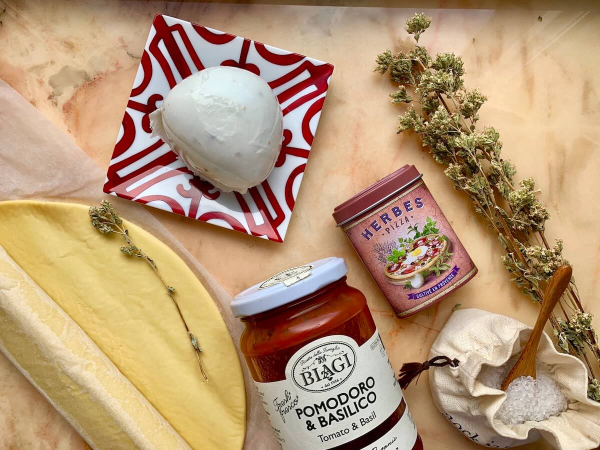 Итак, берем готовое живое тесто для пиццы, банку консервированных томатов с базиликом, пару шариков моцареллы (с трюфелем или без), сушеный орегано или микс трав для пиццы, морскую соль и немного оливкового масла.