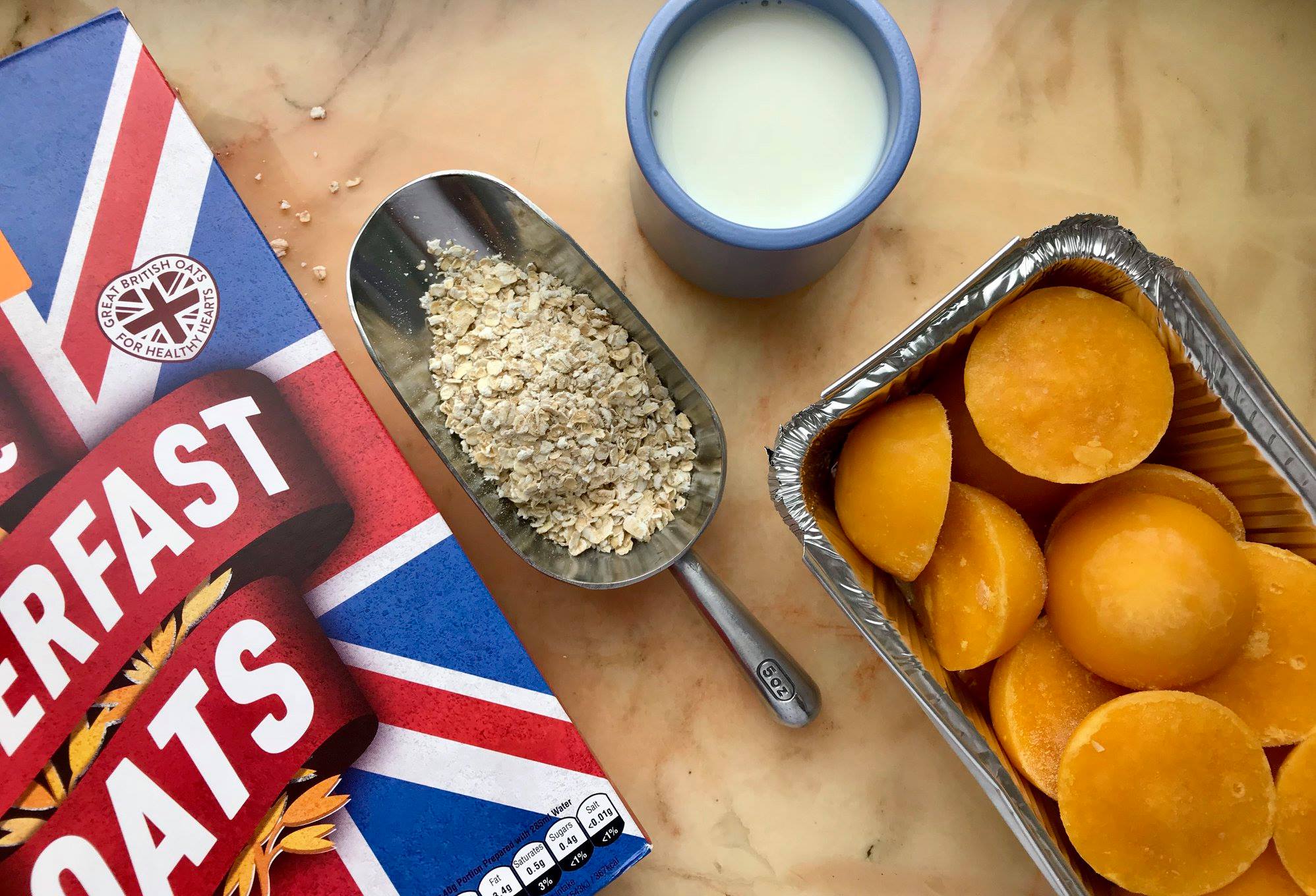 Итак, берем 2 горсти овсяных хлопьев, 150 мл молока, ваниль или корицу по вкусу, манго.