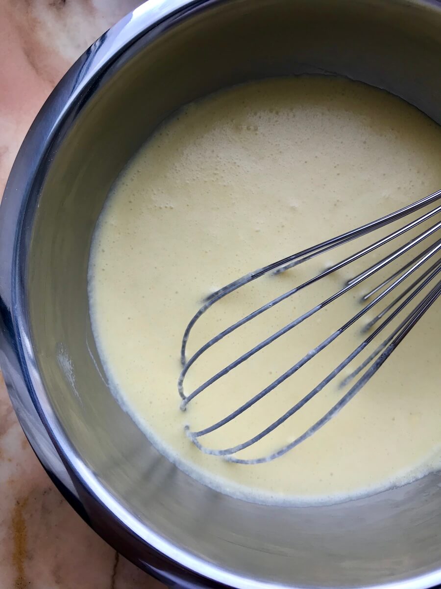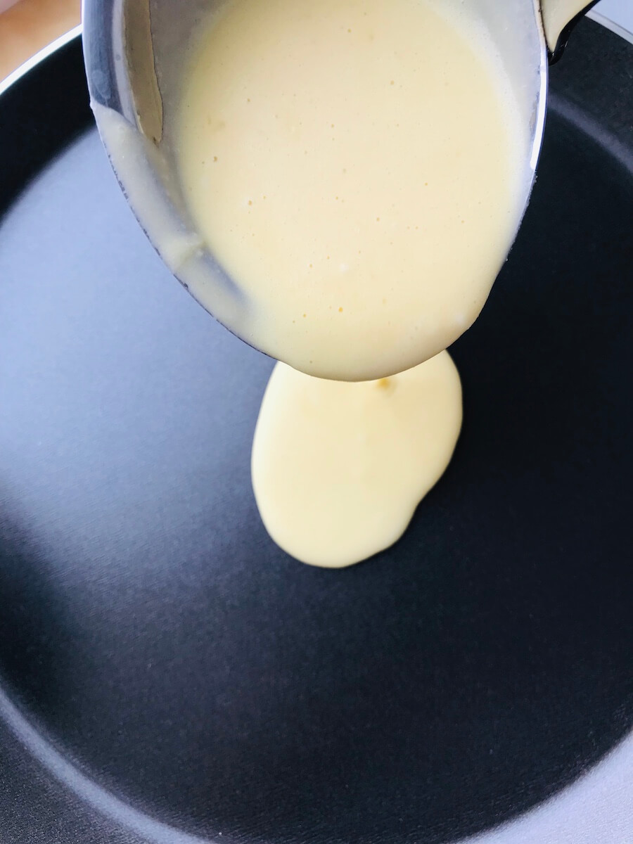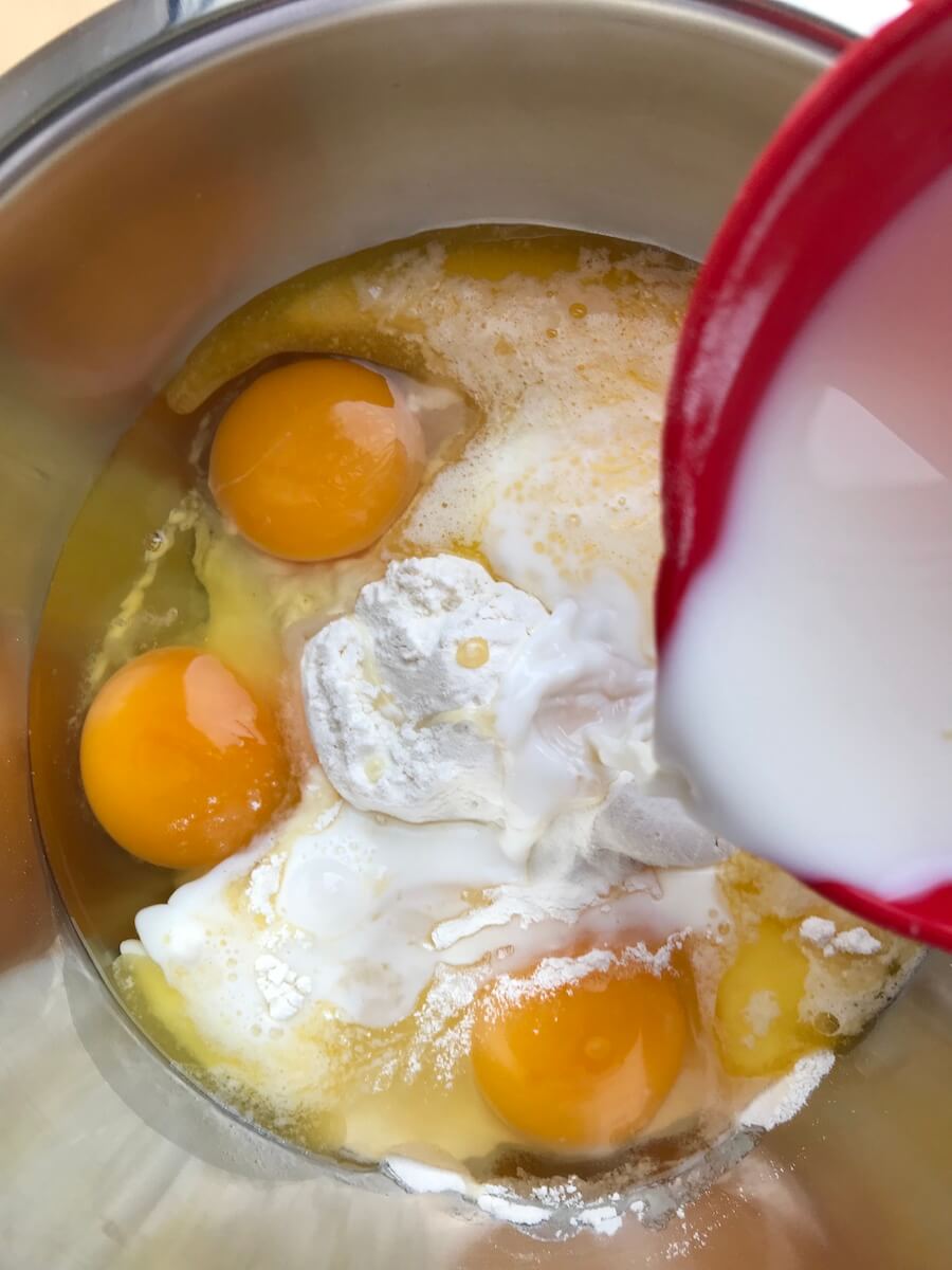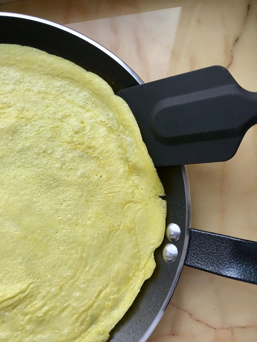 Итак, берём чашку (200 г) просеянной пшеничной муки, 2/3 чашки молока, 2/3 чашки воды, 3 столовые ложки растопленного масла, 3 яйца и чуть соли. Все ингредиенты смешиваем в миске до однородного состояния и отправляем в холодильник минимум на 30 минут (мука впитает в себя всю влагу).