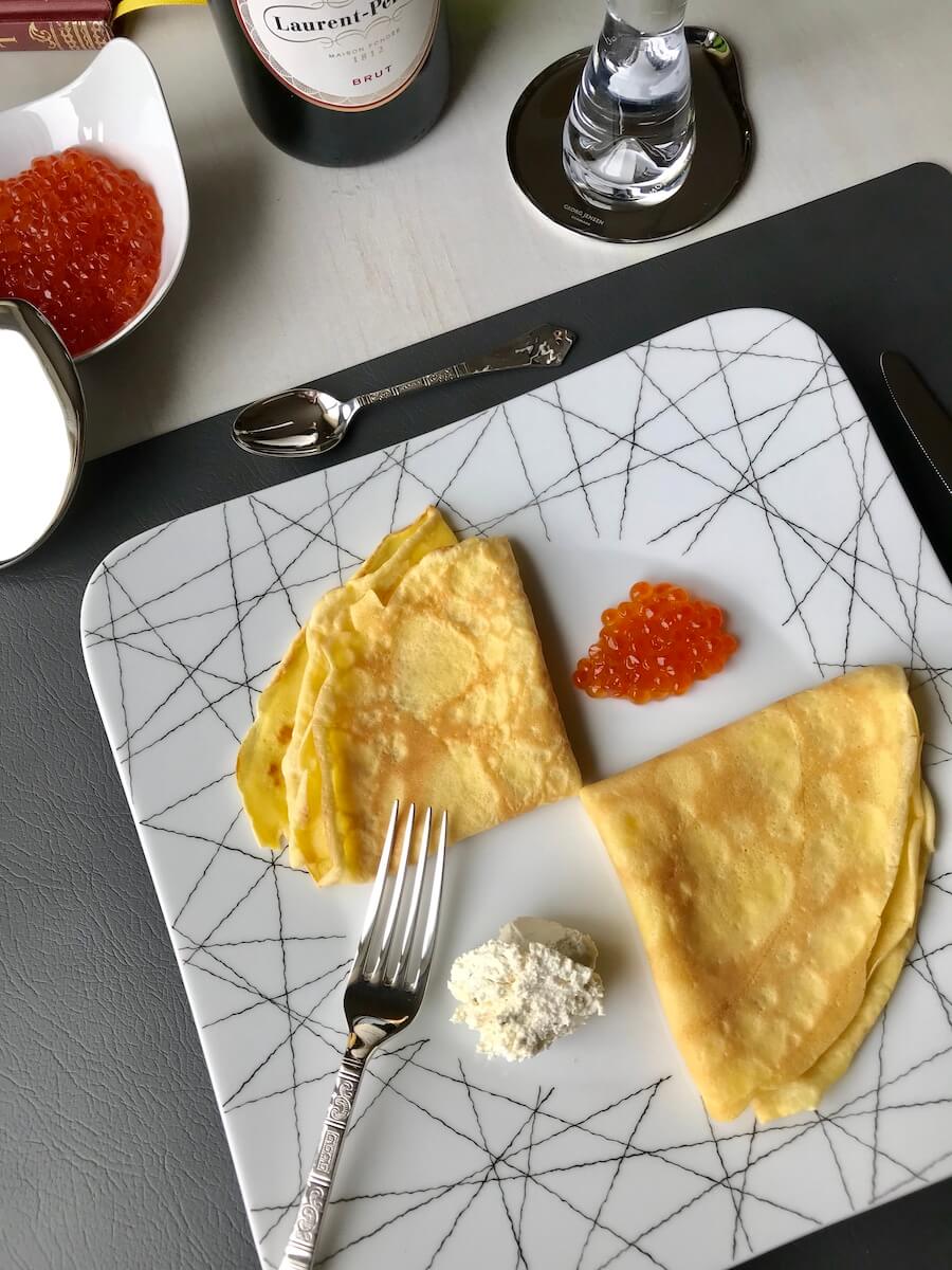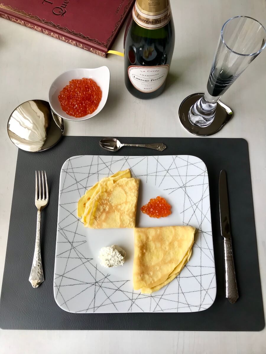 На носу Масленица, но это ровным счётом ничего не значит — базовый рецепт французских блинов нужно знать наизусть и использовать в любое время года. Блины — одно из самых старых, но не теряющих сегодня актуальности блюд. Века назад это было едва ли не главным лакомством на свадебных славянских застольях — знаменитый курник. Сейчас же можно миксовать муку, добавляя к пшеничной гречневую или кокосовую. Такая же история и с начинками — что душе угодно. Моей душе, например, угодно подать блины со сметаной и икрой.