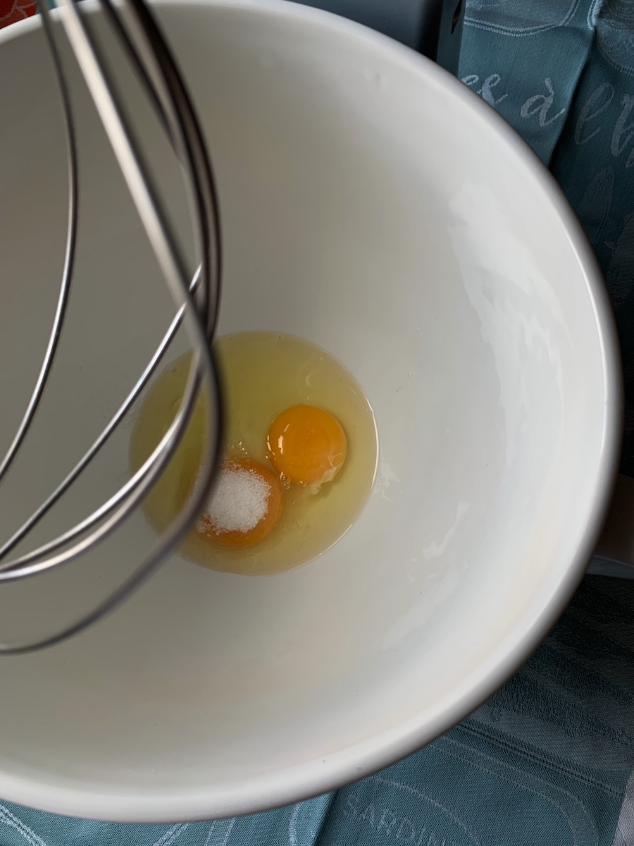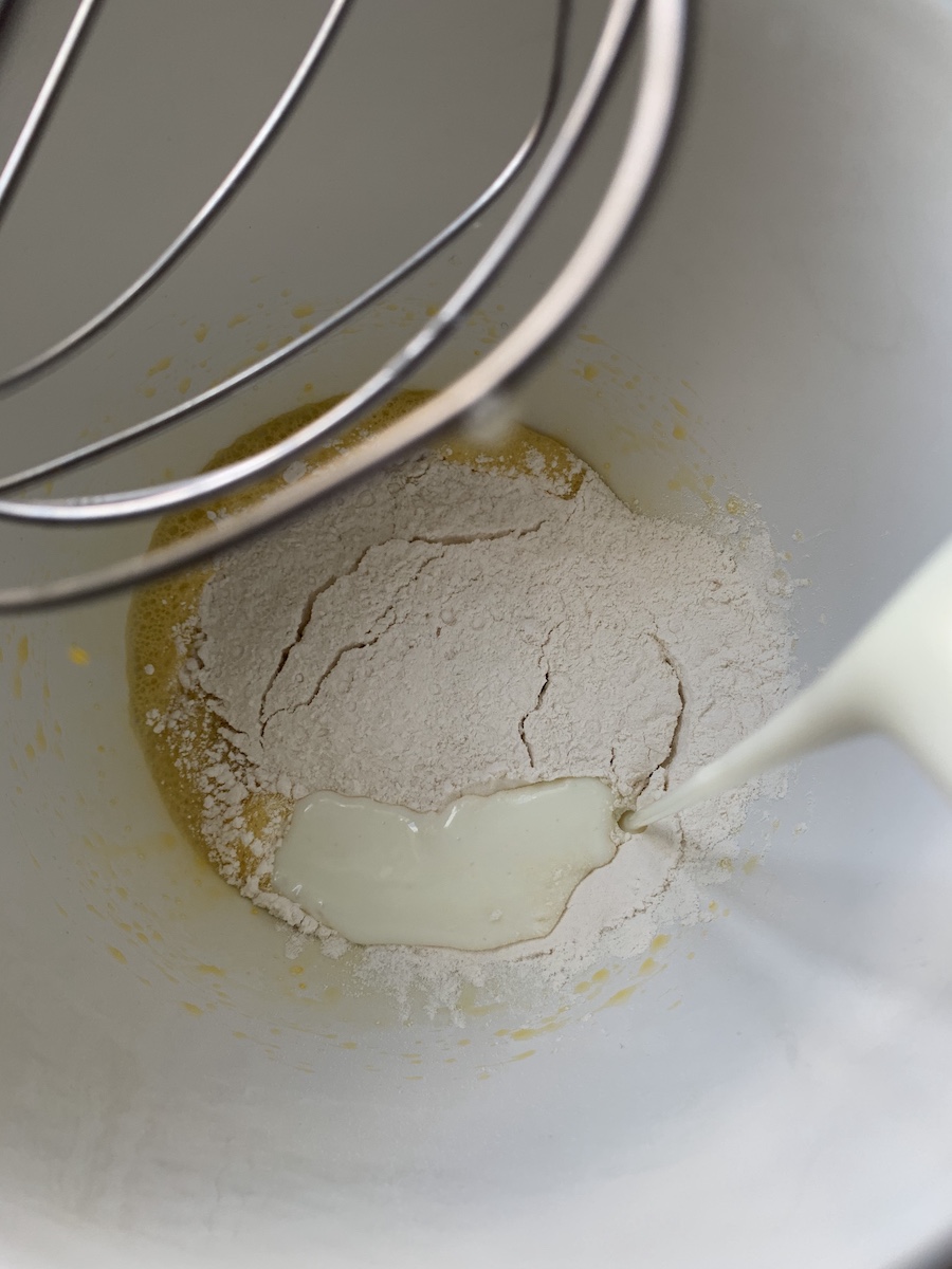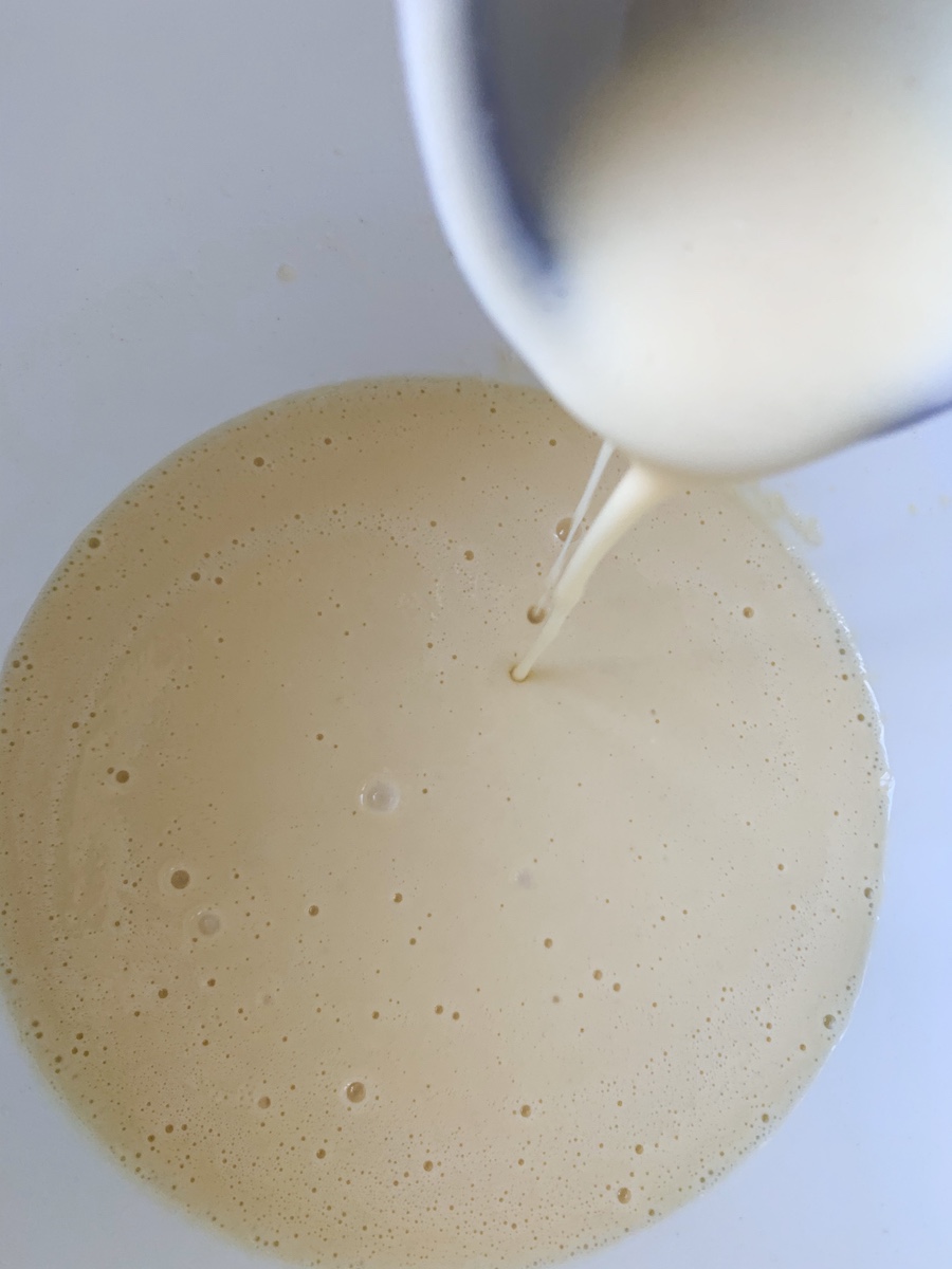 У чаші комбайна збити яйця з цукром та сіллю (як для омлету), додати борошно та кефір, знову збити. У гарячій воді розчинити соду та влити суміш до тіста. Перемішати до однорідного стану.
