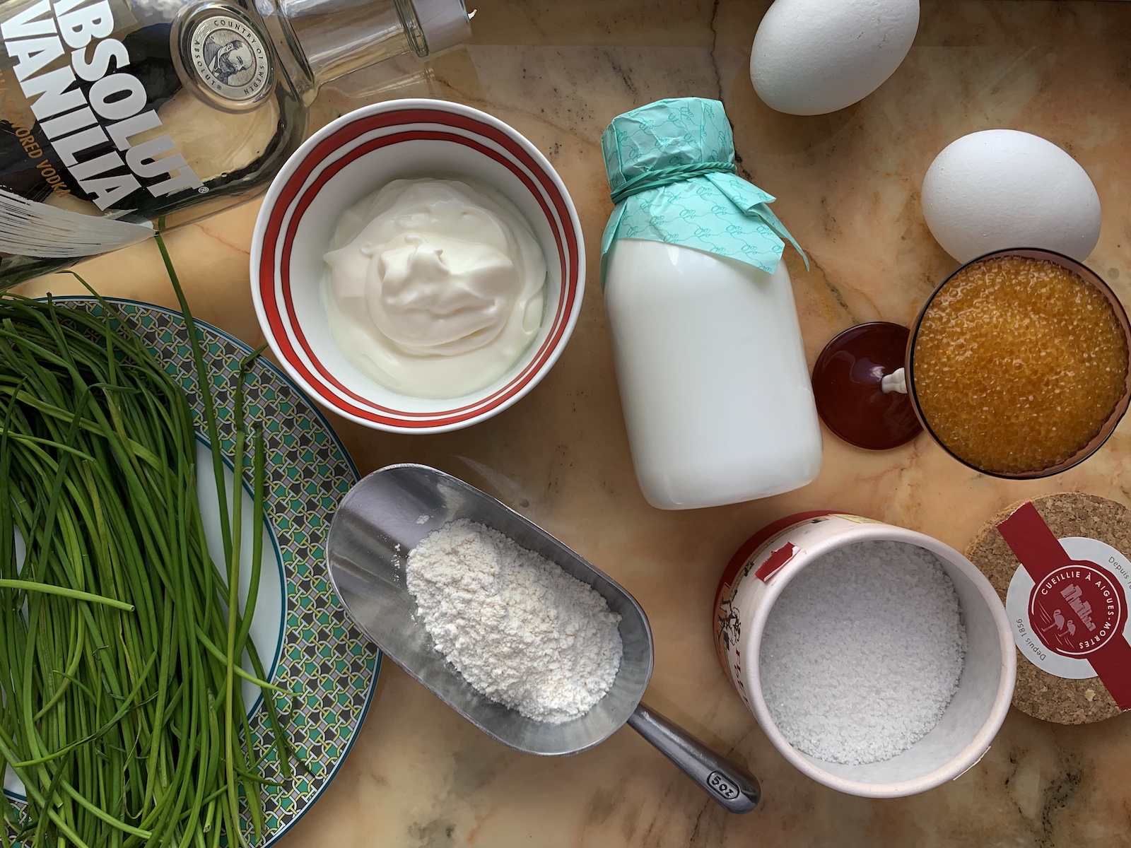 Отже, на 10 млинців беремо: 2 яйця, 1/2 столової ложки цукру, 1/2 чайної ложки солі, 125 г борошна, 150 мл кефіру, 150 мл гарячої води, 1/2 чайної ложки соди, 2 столові ложки оливкової олії. Для подачі: 200 г сметани, 100 г щучої ікри, пір'я шніт-цибулі, горілка.