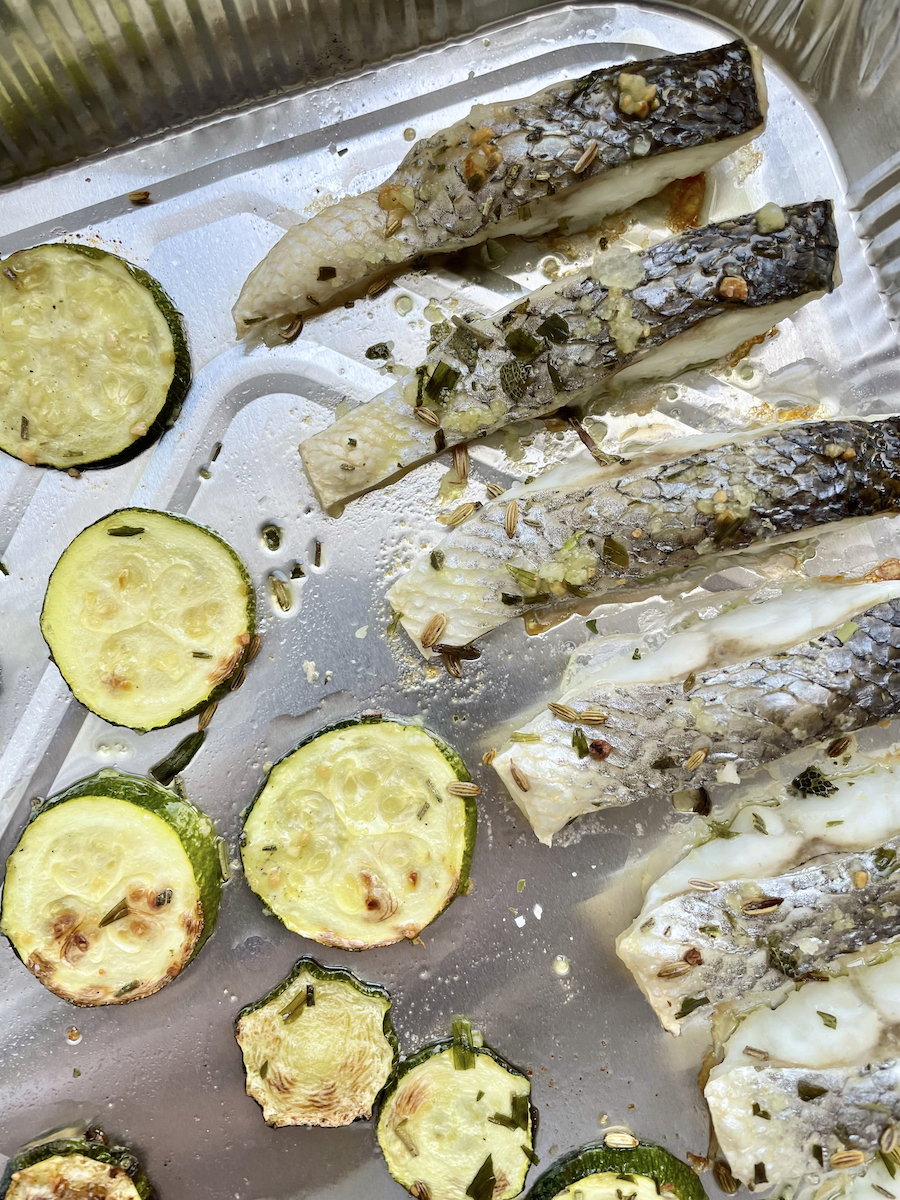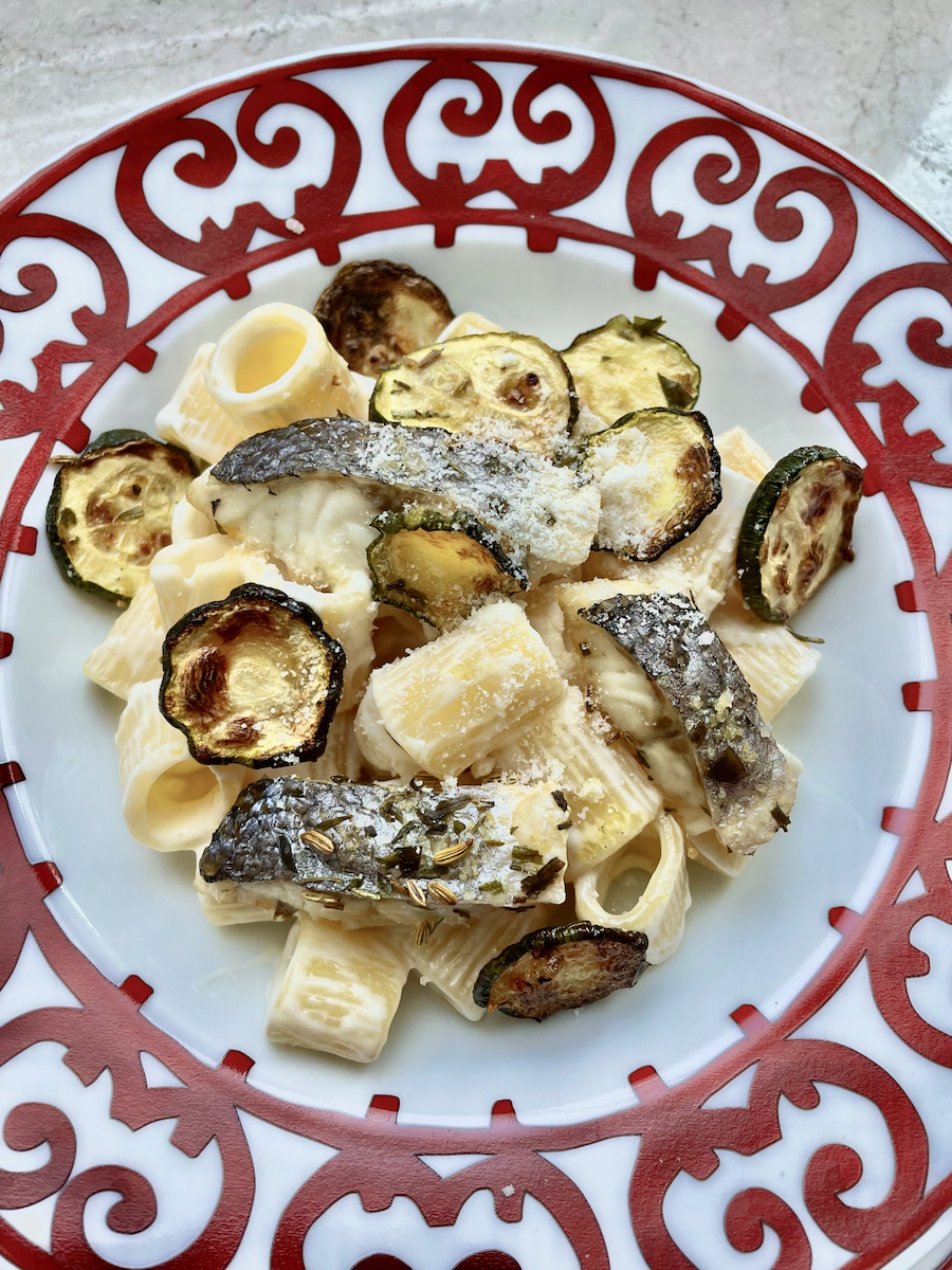 Итак, берем небольшой кабачок, одно филе сибаса, пасту по вкусу, соль, микс трав для приготовления рыбы, сушеный чеснок, соль, оливковое масло, жирные сливки (33%) и пармезан.