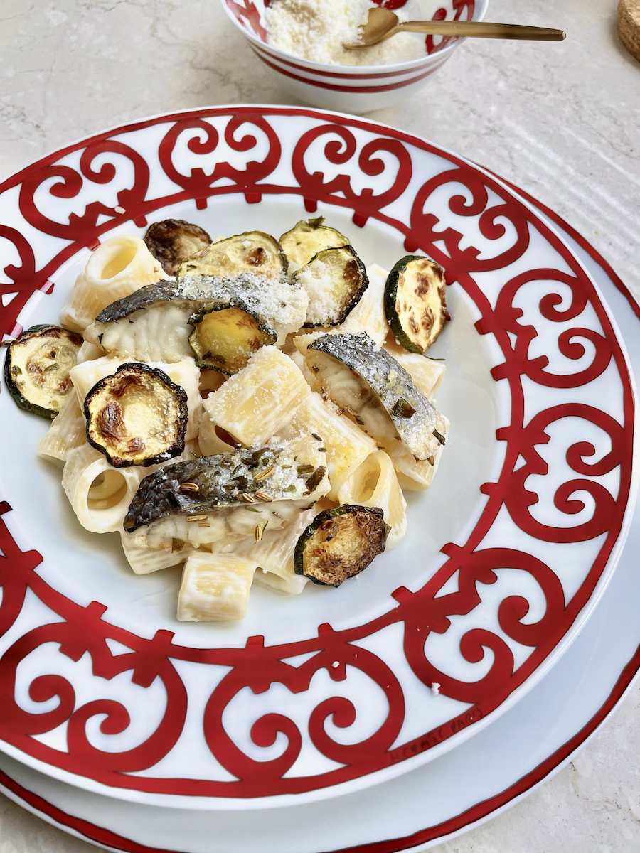 Духовку разогреть до 180 градусов. Кабачок нарезать тонкими колечками, сложить в миску, приправить солью и сушеным чесноком, добавить оливковое масло, перемешать, выложить слоем в форму для запекания. Филе рыбы нарезать поперек полосками шириной не более 2 см, выложить в форму для запекания, сбрызнуть оливковым маслом, приправить солью и травами. Все отправить в духовку на 20 минут. Сварить пасту, как указано на упаковке, слить воду. В ту же кастрюлю влить сливки и добавить тертый пармезан, поставить на небольшой огонь и постоянно помешивать, пока соус не станет однородным, добавить пасту, хорошо перемешать.