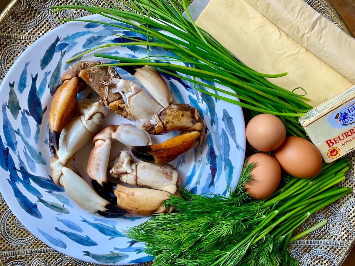 Для начинки: 300 г клешней краба или 10 крупных лангустинов, 50 г растопленного сливочного масла, 3 сваренных вкрутую яйца, пучок укропа, соль, свежемолотый перец. И пару желтков для смазывания пирожков.