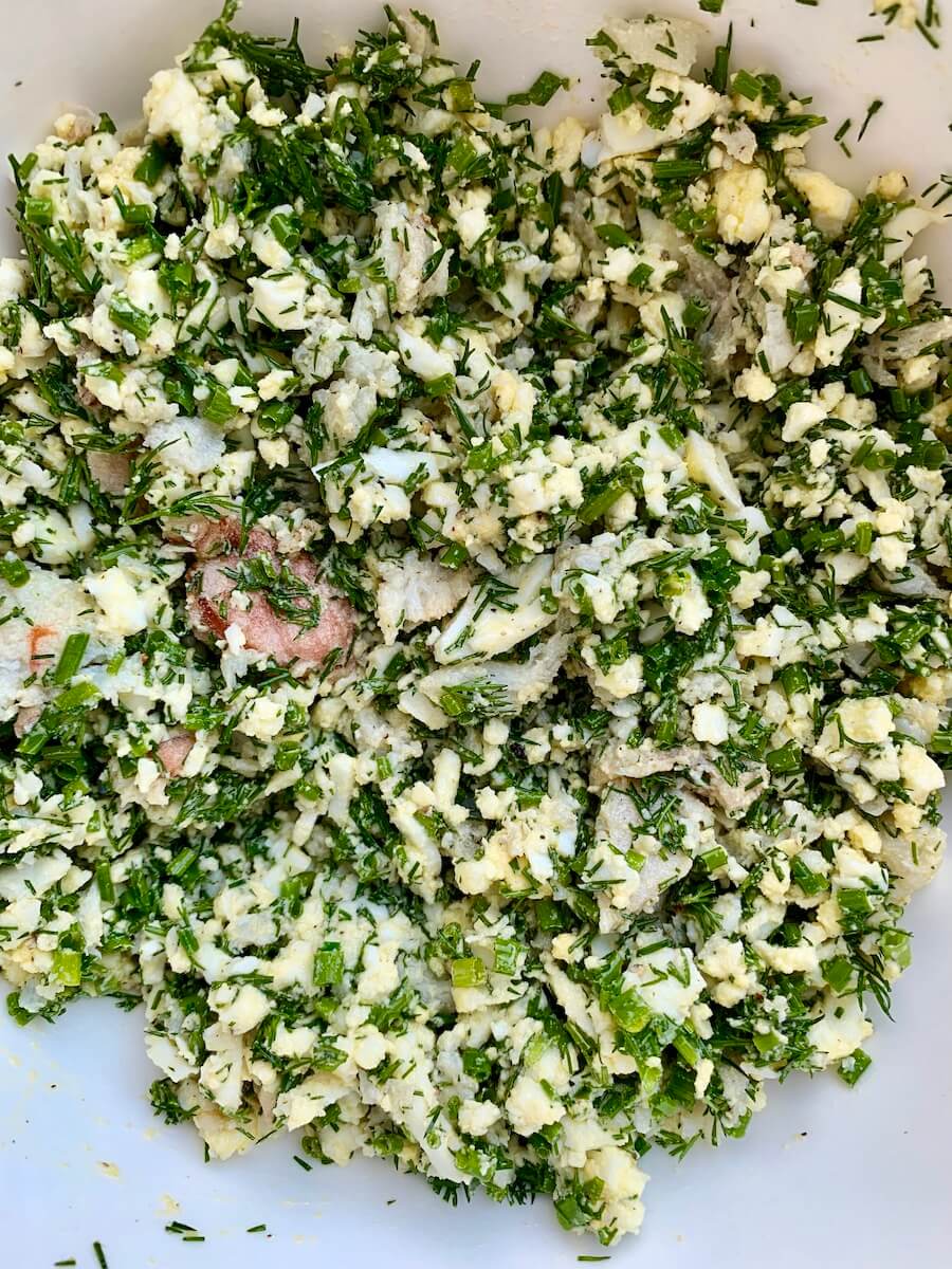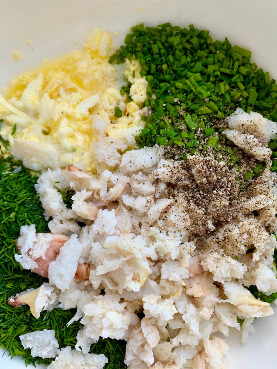 До боли знакомая начинка из вареных яиц и зелени может заиграть новыми красками, если добавить к ней мясо краба и сливочное масло – прекрасный вариант для воскресного бранча. Можно подать как с игристым, так и к чаю.