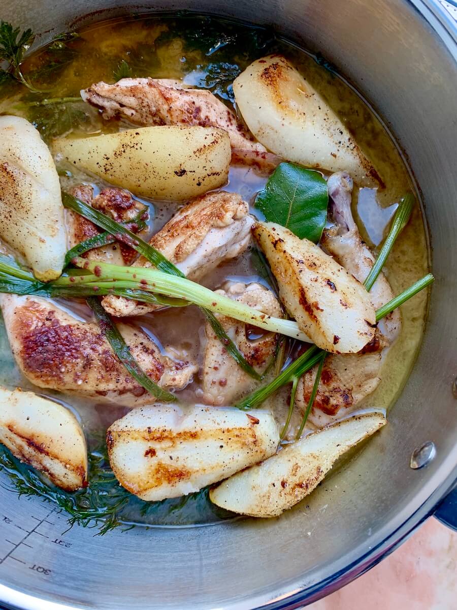 Тем временем разделать цыпленка на порционные куски, приправить их солью и обжарить на той же сковороде, где были груши, до золотистой корочки. Добавить к цыпленку нарезанный кольцами лук, молотую корицу, мускатный орех и столовую ложку жидкого меда, все хорошо перемешать, залить сидром, положить сверху букет гарни, накрыть крышкой и тушить на среднем огне 40-50 минут. Снять сковороду с огня, выложить сверху дольки груш, накрыть крышкой и оставить на 5 минут.