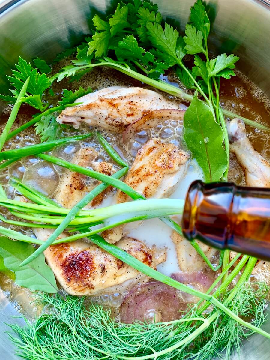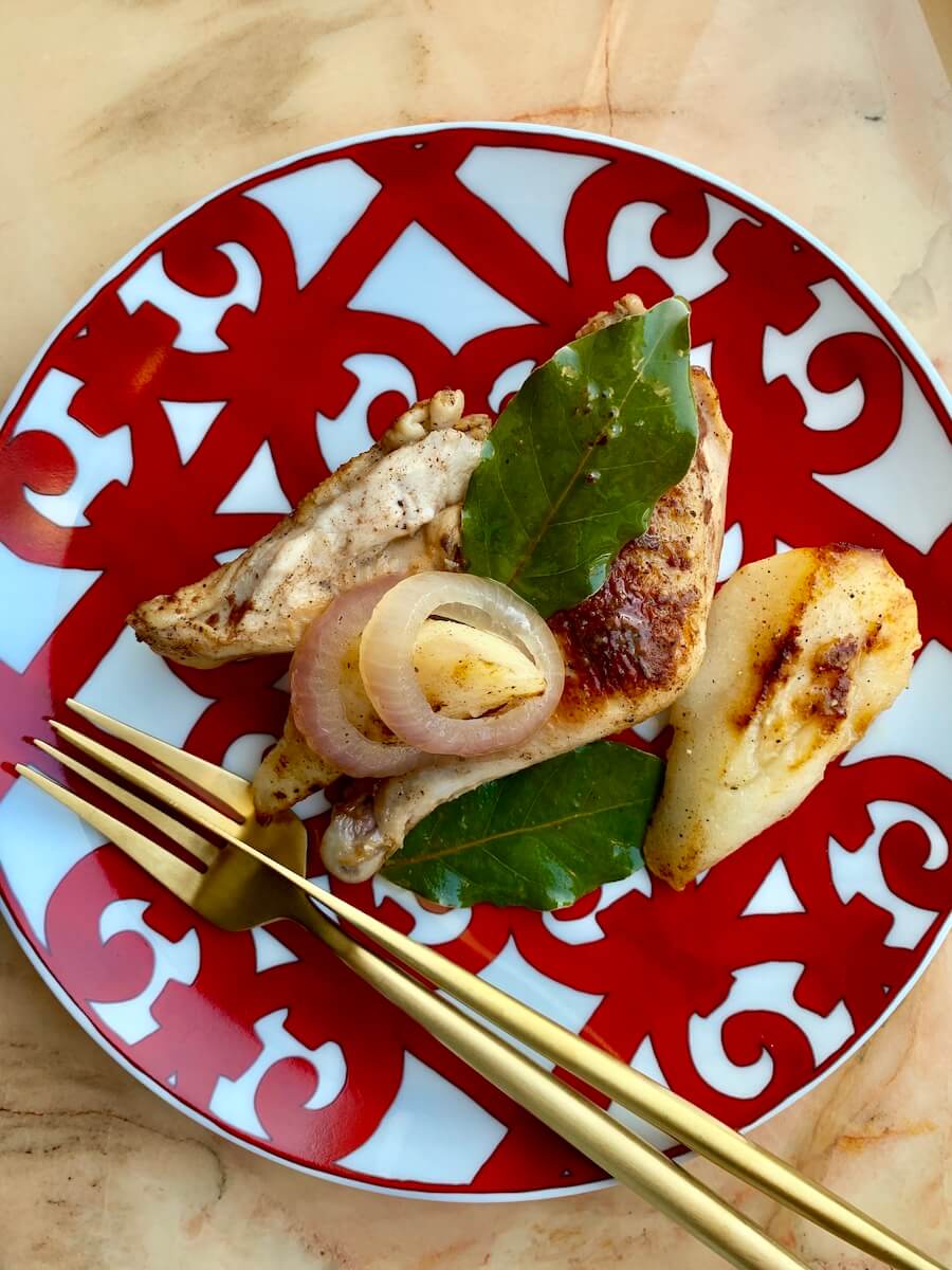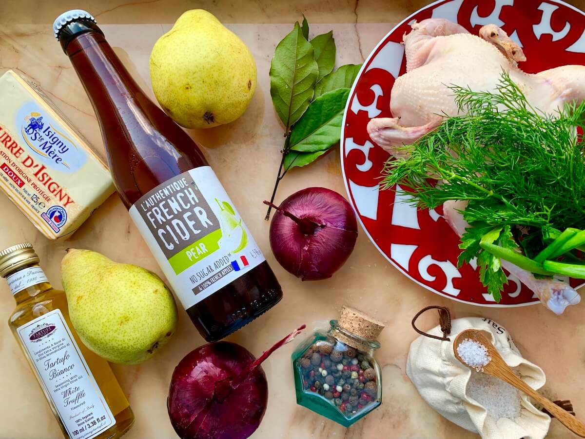 Итак, на 4 порции берем фермерского цыпленка (тушка до 500 г), сладкую красную луковицу, две сладких, крепких и пахучих груши (у меня – сорта «Парижанка»), 30 г сливочного масла, 30 мл оливкового масла, 300 мл грушевого сидра, соль, свежемолотый перец и букетик гарни (розмарин, петрушка, укроп, перья зеленого лука и лавровый лист), столовая ложка меда, по щепотке мускатного ореха и корицы.