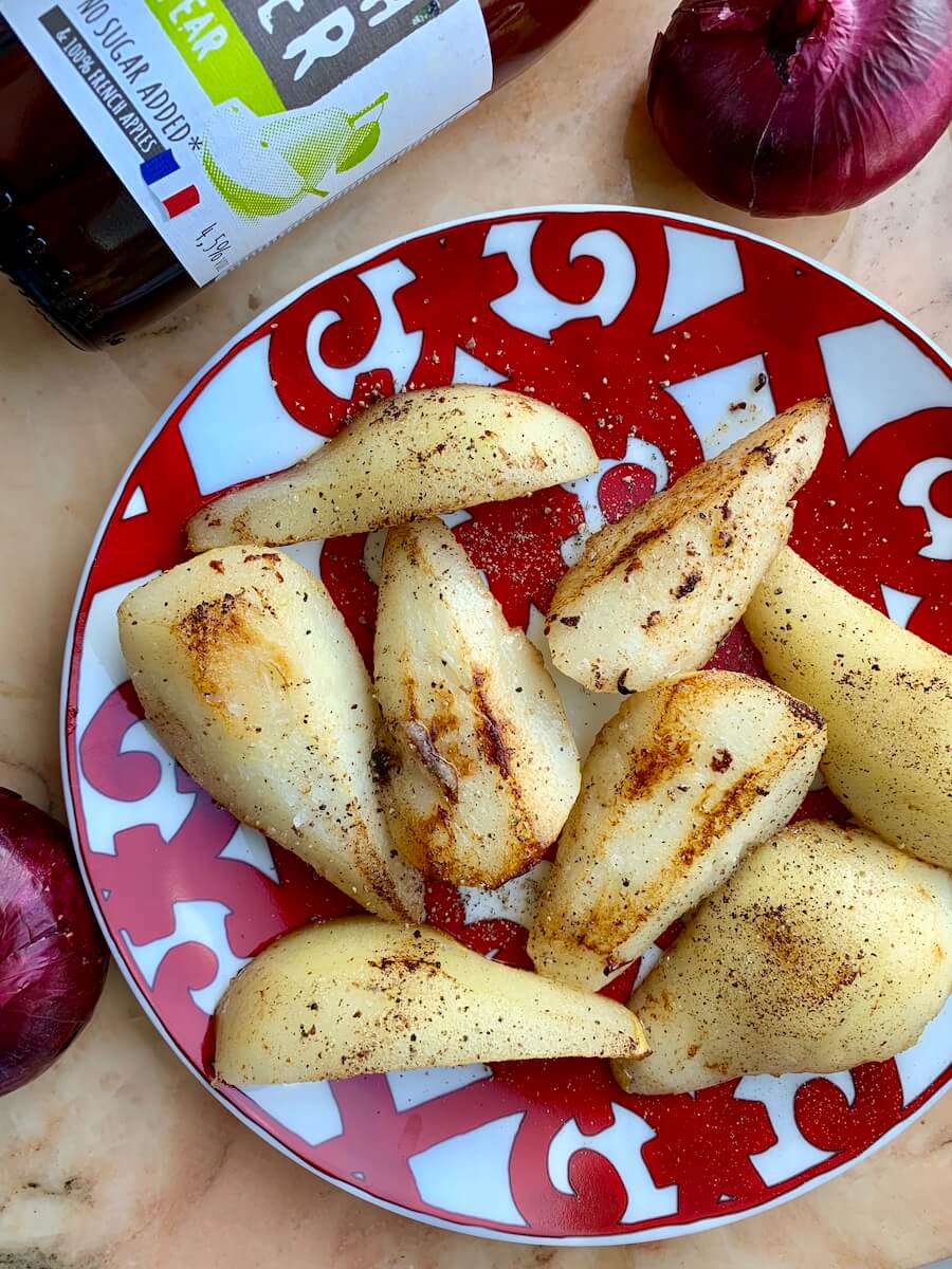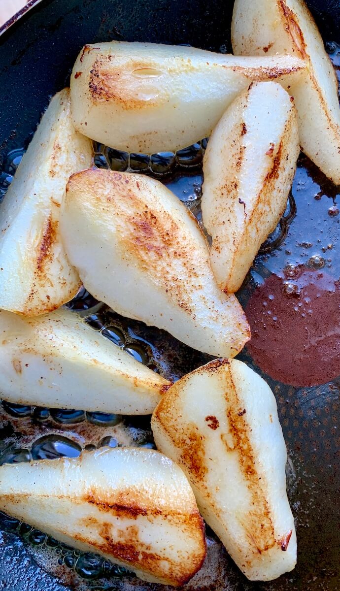 Груши предварительно очистить, разрезать на 4 части и удалить сердцевину. В сковороде на смеси масел обжарить дольки груш до румяной корки и сладко-сливочного аромата, приправить солью и перцем, переложить их на тарелку.