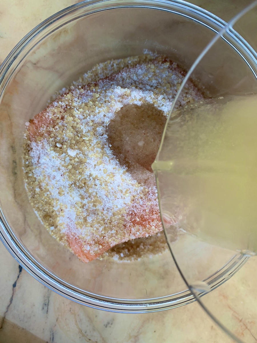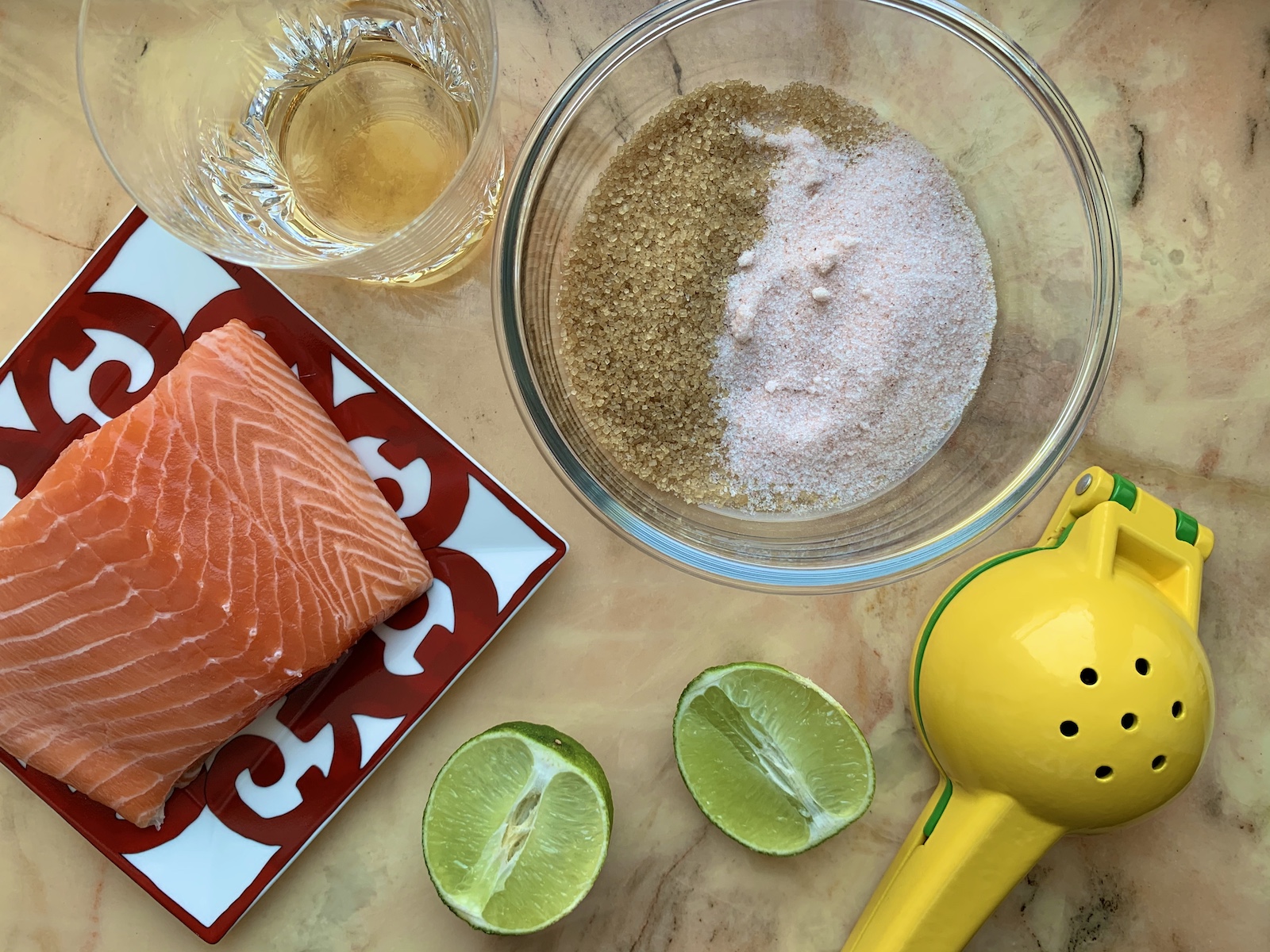 Итак, берем кусок лосося на коже (250 г), сок 1 лайма, 50 мл виски, 2 столовые ложки соли и 2 столовые ложки сахара.