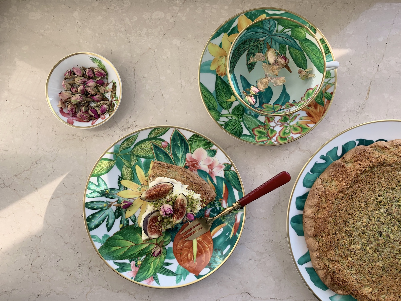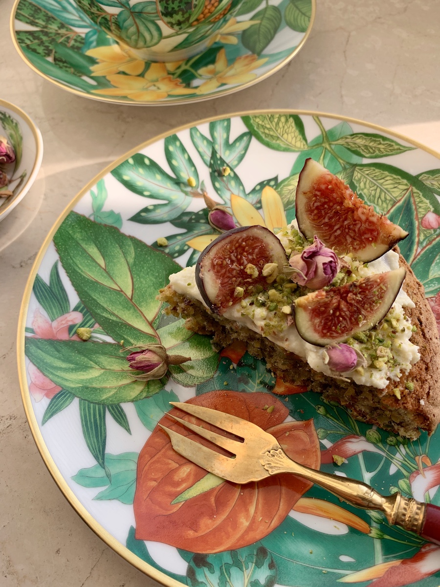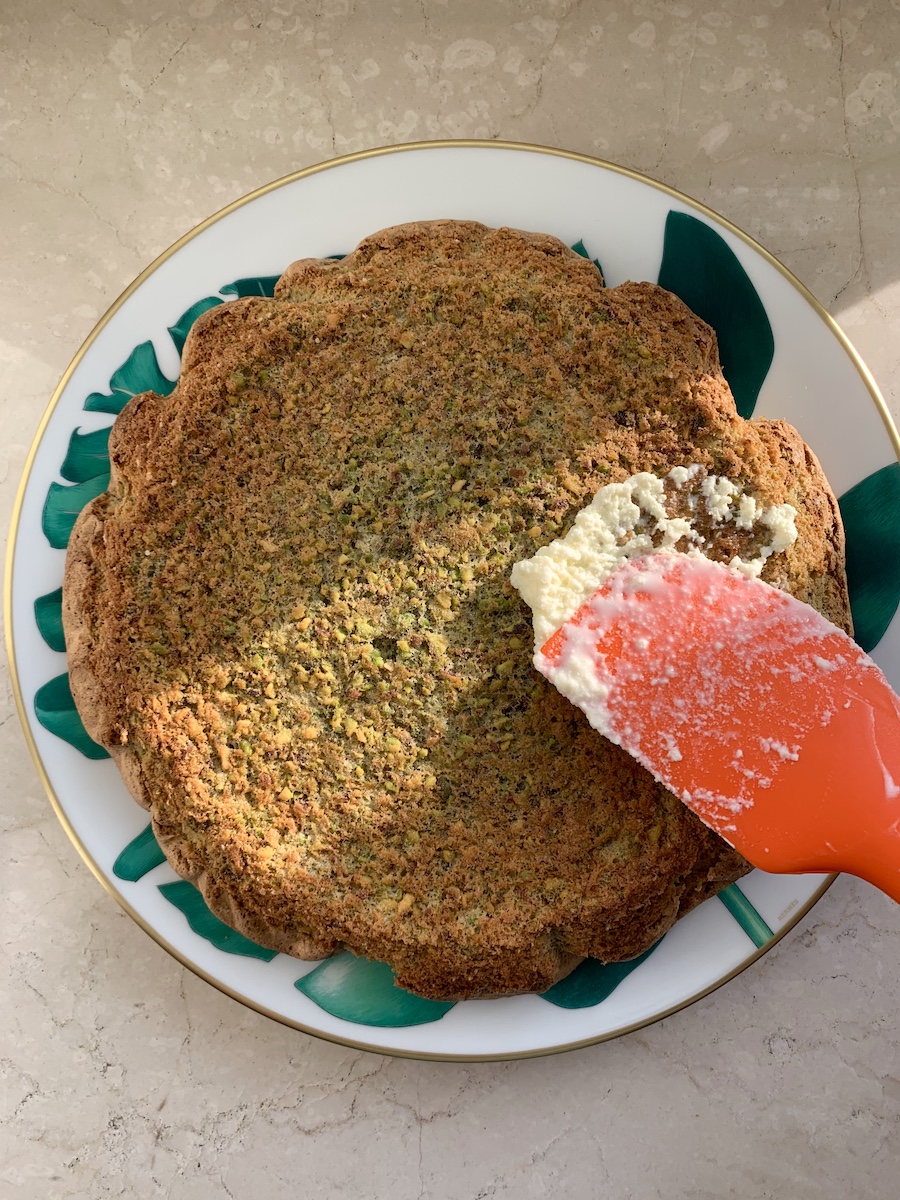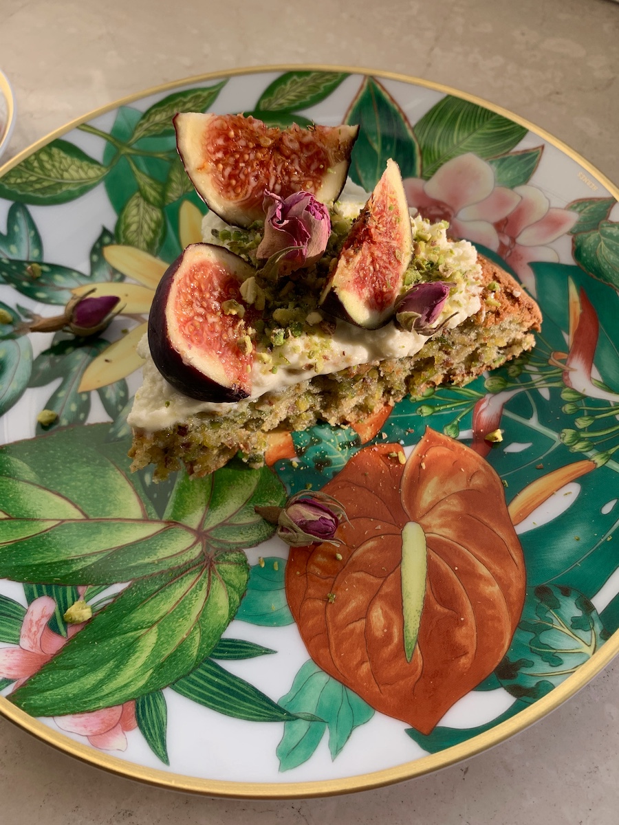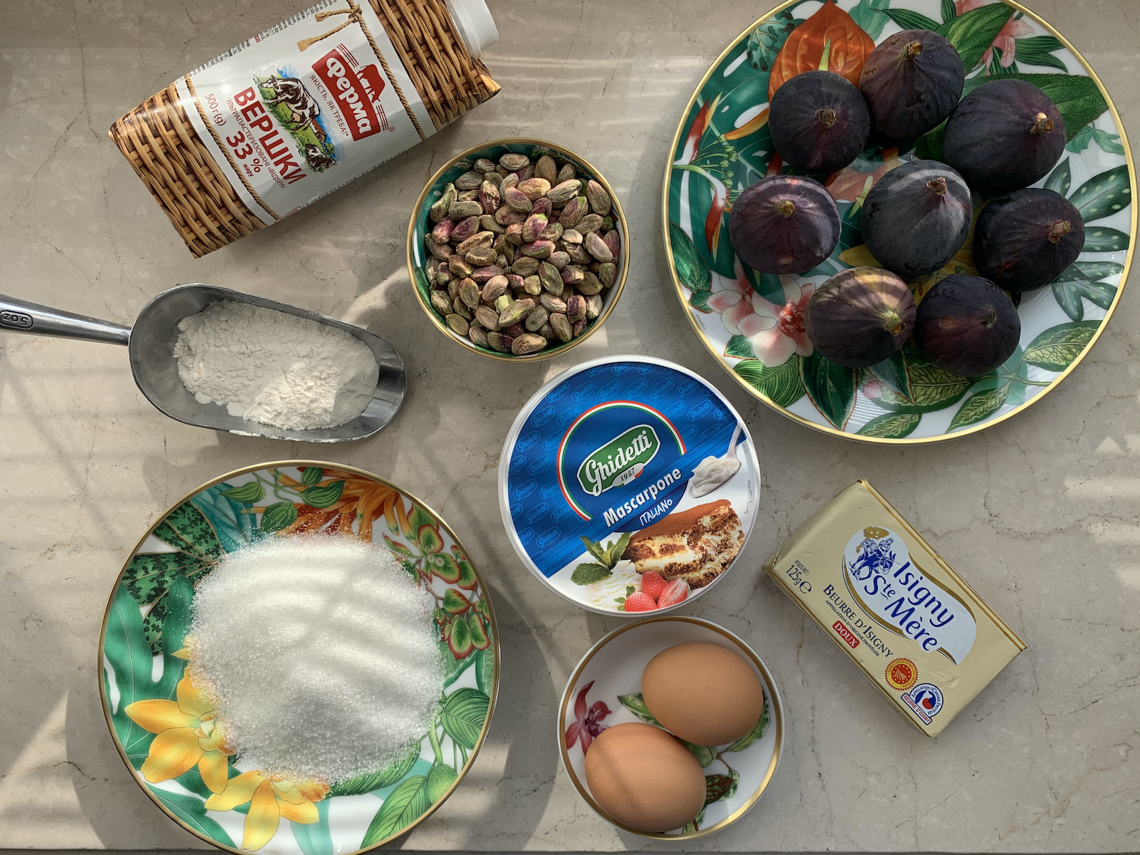 Итак, берем: 200 г очищенных несоленых фисташек, 120 г растопленного сливочного масла, 80 г сахара, чайную ложку ванильной эссенции, 4 желтка, 4 белка, 2 столовые ложки муки, соль и еще 30 г сахара. Для крема: 120 мл сливок жирностью не менее 33%, 250 г сыра маскарпоне, 2 столовые ложки меда и чайную ложку лимонного сока. Для украшения: инжир, сушеные цветы и немного молотых фисташек.