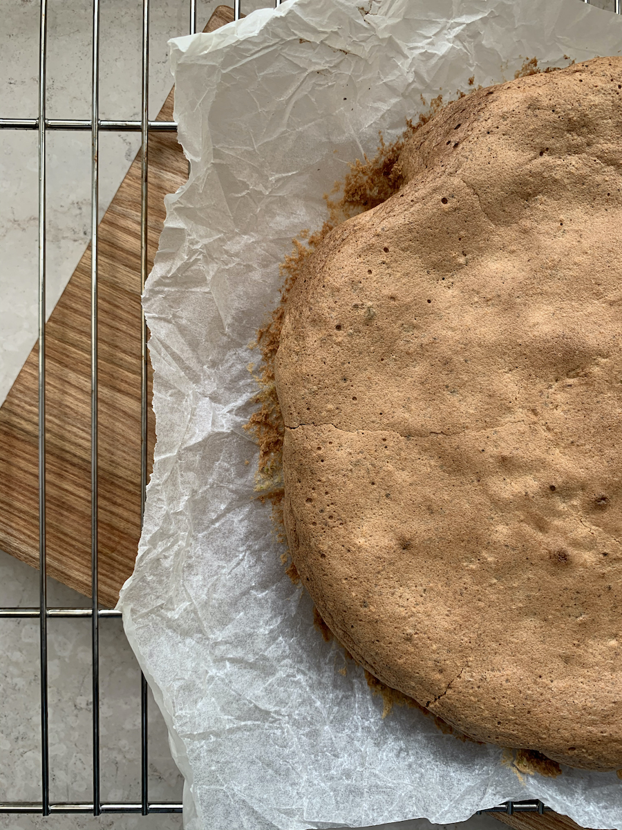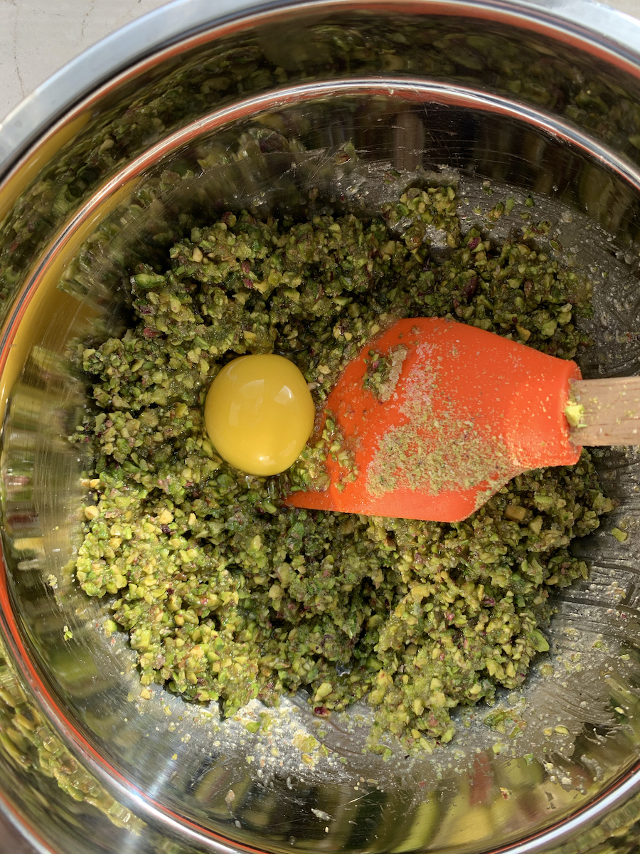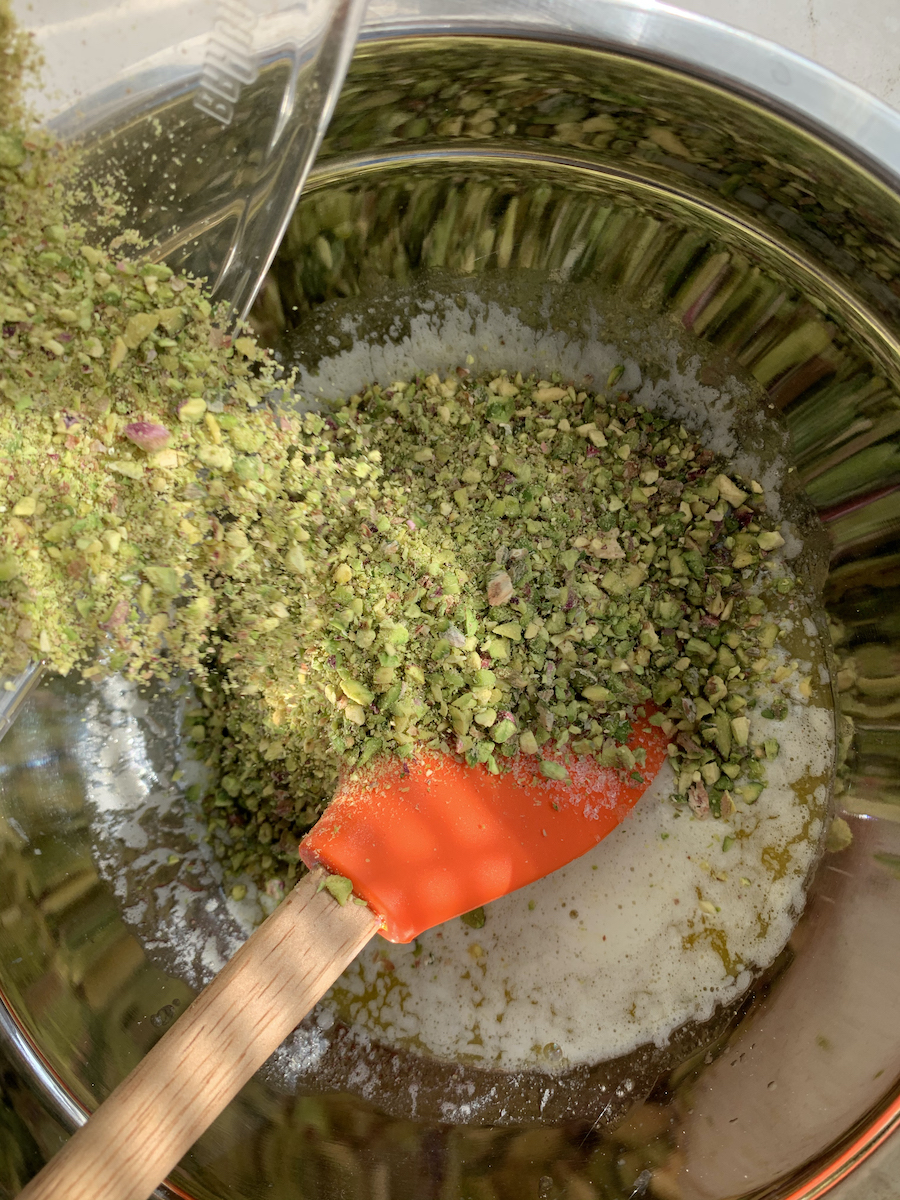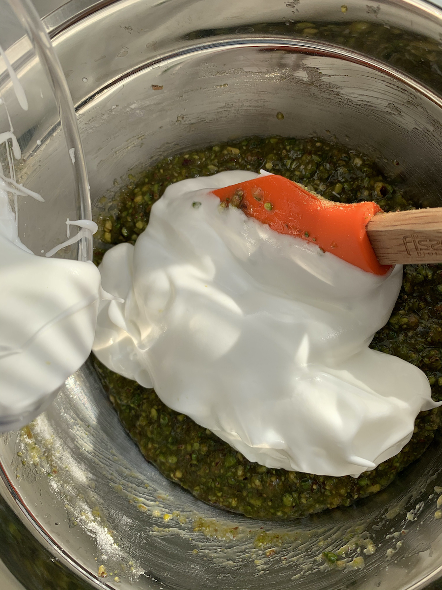 Духовку разогреть до 180 градусов. Растопить сливочное масло, добавить сахар и измельченные в блендере фисташки (как можно мельче), все хорошо перемешать. Добавить ваниль, муку и ввести по одному четыре желтка, постоянно перемешивая смесь до однородного состояния. Отдельно взбить белки, добавив немного соли. Как только образуются мягкие пики, постепенно ввести 30 граммов сахара, продолжая взбивать до жестких пиков. Переложить белки в миску с основой для теста, хорошо перемешать. Форму предварительно смазать маслом или застелить пекарской бумагой, вылить тесто. Отправить форму в духовку на 40 минут. Проверить готовность ножом – он должен остаться сухим. Вынуть пирог из формы и полностью остудить.